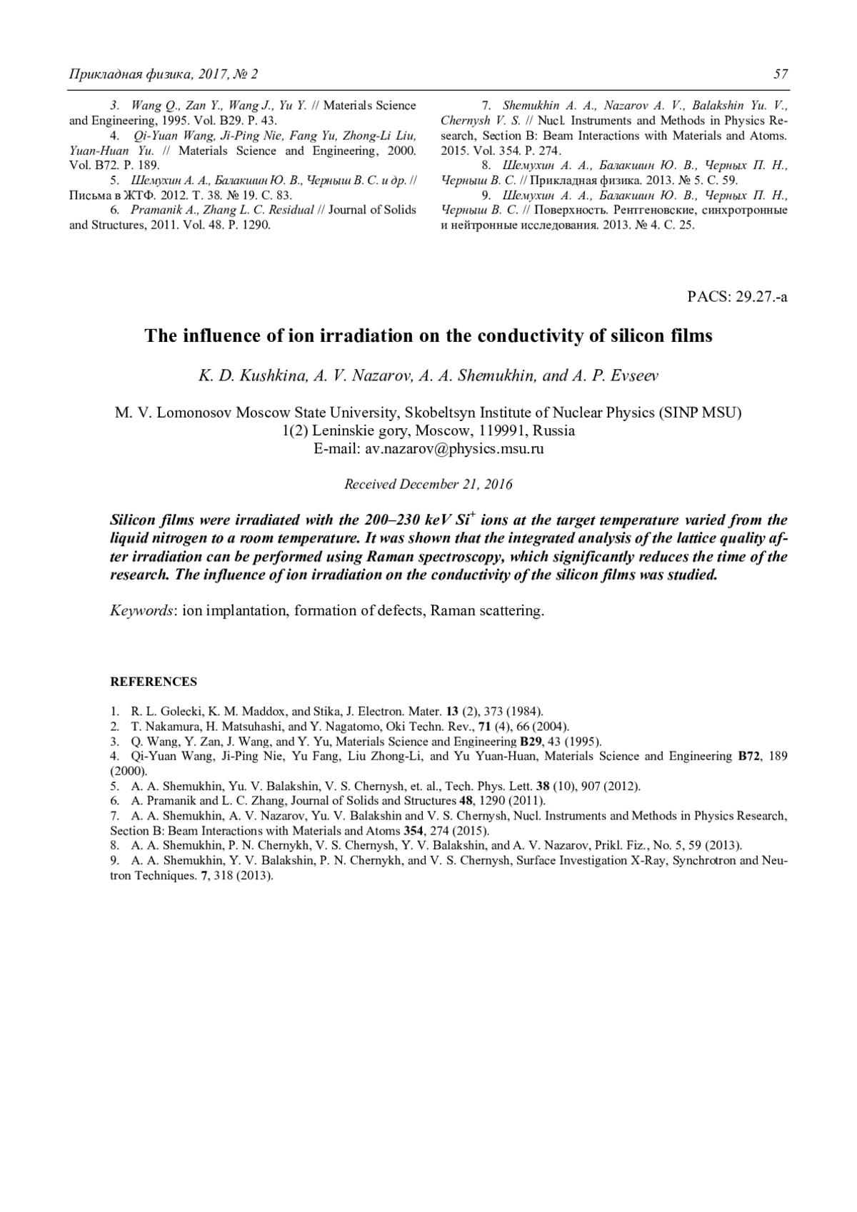 K. D. Kushkina, A. V. Nazarov, A. A. Shemukhin, and A. P. Evseev The influence of ion irradiation on the conductivity of silicon films 54