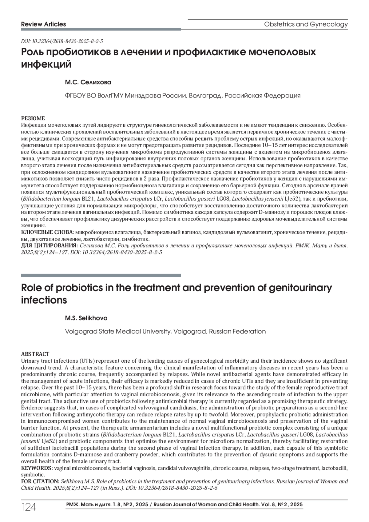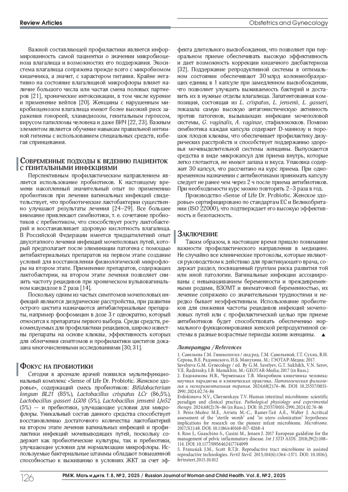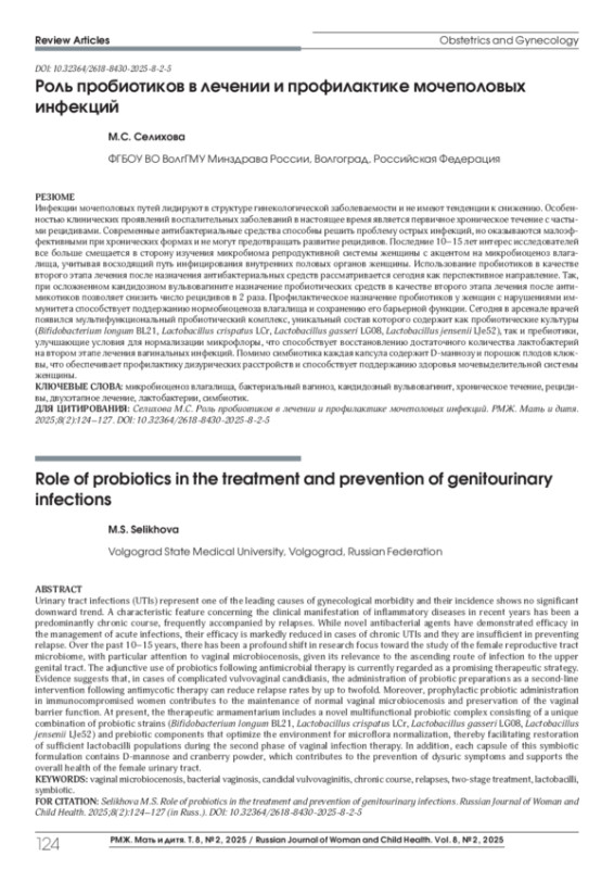 31. Громова O.A., Торшин И.Ю. О перспективах применения лактобактериальных пробиотиков, D-маннозы и экстрактов клюквы в терапии инфекций мочевыводящих путей. Акушерство, Гинекология и Репродукция, 2023; 17(4):485-499. DOI: 10.17749/2313-7347/ob.gyn.rep.2023.442