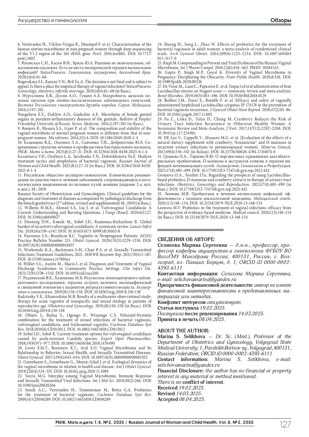 32. Леонова M.B. Пробиотики в лечении вагинальных инфекций: эффективность с позиции доказательной медицины. Медицинский совет, 2020;(13):148-154. Х-2020-13-148-154. DOI: 10.21518/2079-701