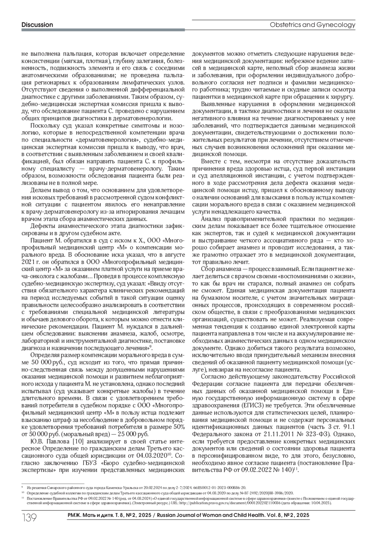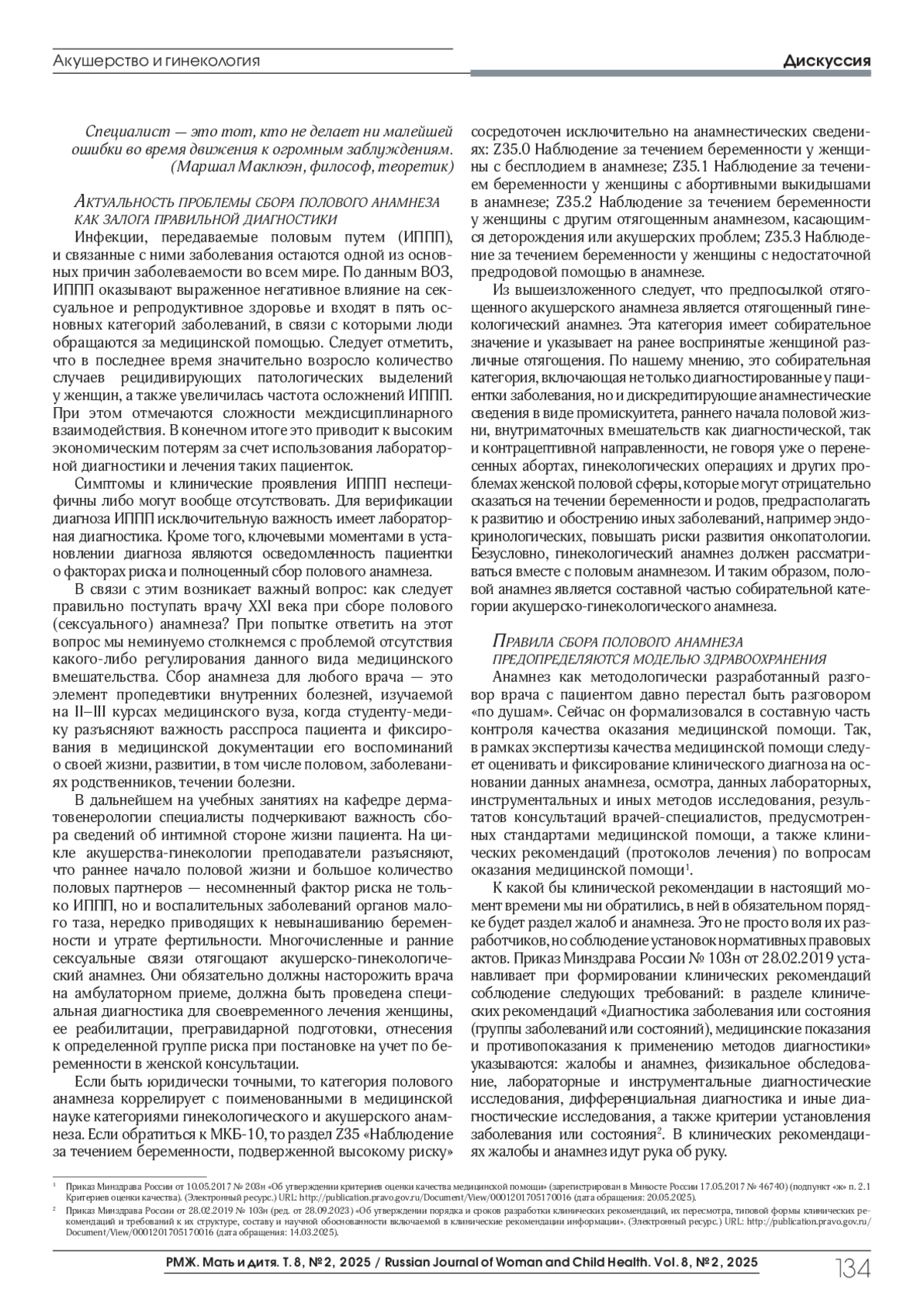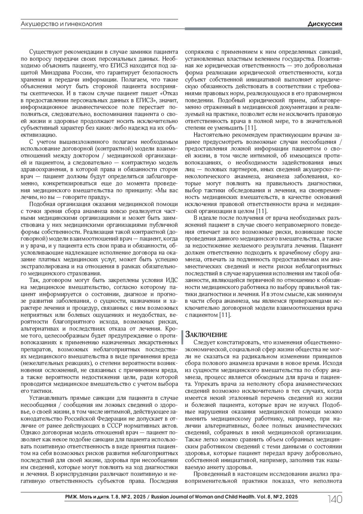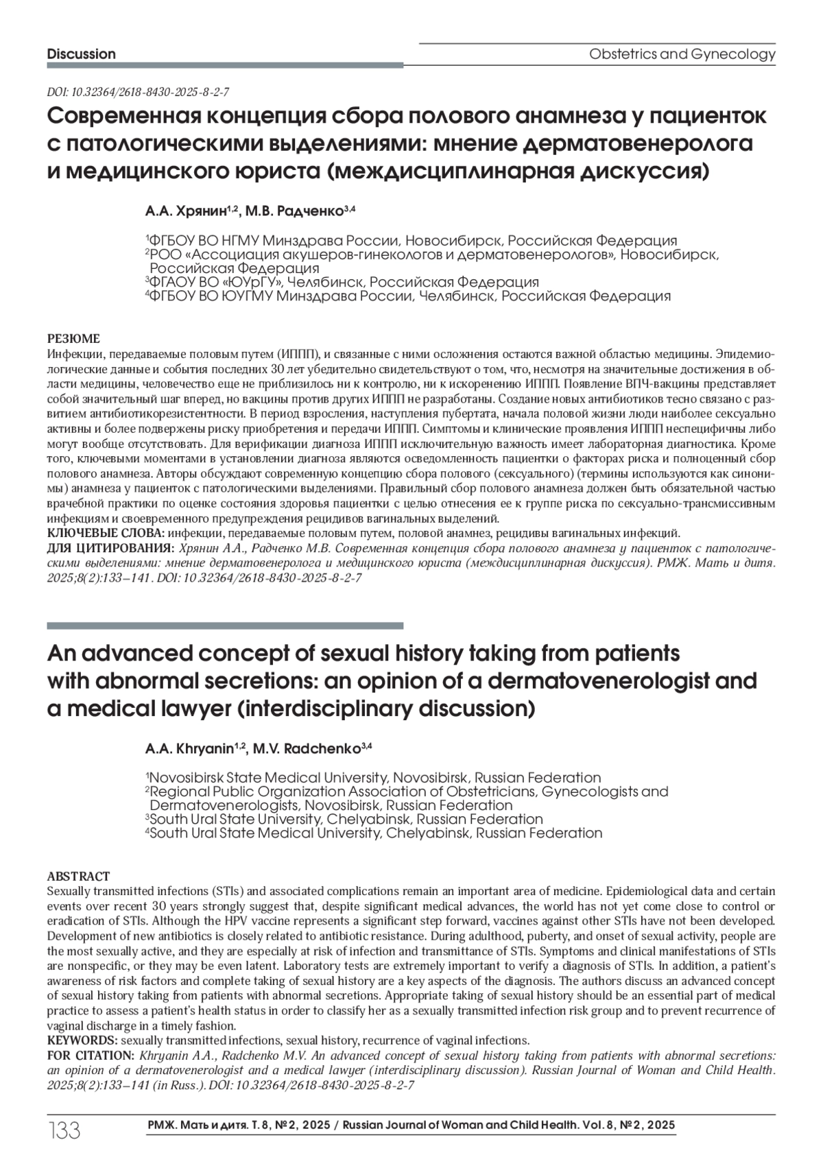 Khryanin A.A., Radchenko МУ.Rules for collecting sexual anamnesis in case of vaginal discharge: opinion of a dermatovenerologist and medical lawyer. StatusPraesens, Gynecology, obstetrics, infertile marriage. 2025;1(118):49-55 (in Russ.).