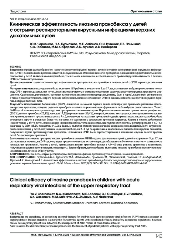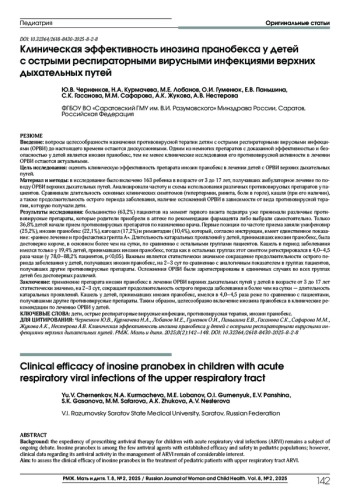 Результаты исследования: большинство (63,2%) пациентов на момент первого визита педиатра уже принимали различные противовирусные препараты, которые родители приобрели в аптеке по рекомендации фармацевта либо выбрали самостоятельно. Только 36,8% детей начали прием противовирусных препаратов по назначению врача. Первые позиции по частоте приема заняли умифеновир (25,2%), инозин пранобекс (22,1%), кагоцел (17,2%) и римантадин (10,4%), который, согласно инструкции, имеет единственное показание: «раннее лечение и профилактика гриппа А». Длительность катаральных проявлений у детей, принимавших инозин пранобекс, была достоверно короче, в основном более чем на сутки, по сравнению с остальными группами пациентов. Кашель в период заболевания имелся только у 19,4% детей, принимавших инозин пранобекс, тогда как в остальных группах этот симптом регистрировался в 4,0–4,5 раза чаще (у 78,0–88,2% пациентов, p<0,05). Важным является статистически значимое сокращение продолжительности острого периода заболевания у детей, получавших инозин пранобекс, на 2–3 сут по сравнению с аналогичным показателем в группах пациентов, получавших другие противовирусные препараты. Осложнения ОРВИ были зарегистрированы в единичных случаях во всех группах детей без достоверных различий.
