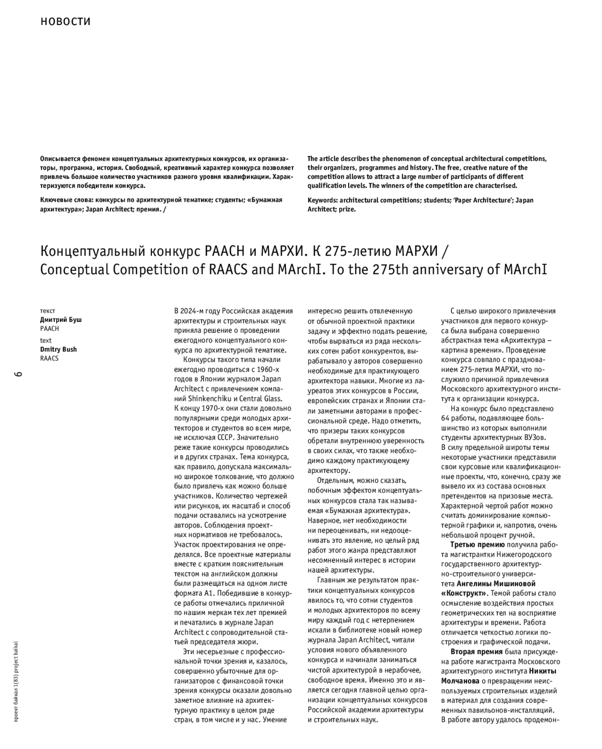 БУШ Д. КОНЦЕПТУАЛЬНЫЙ КОНКУРС РААСН И МАРХИ. К 275-ЛЕТИЮ МАРХИ // ПРОЕКТ БАЙКАЛ. 2025. № 83, ТОМ 22