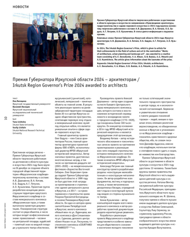 Престижная награда региона – Премия Губернатора Иркутской области творческим работникам за достижение в области культуры и искусства в 2024 году была вручена 26 декабря за создание объекта городской общественной территории «Иерусалимское кладбище» творческому коллективу в составе: А. В. Дорошенко, В. А. Китаев, О. Б. Бадула, А. Г. Петунин, А. О. Кузьмичева. Проектная группа разработала концепцию реконструкции территории иркутского Иерусалимского кладбища в составе мемориального комплекса «Иерусалимская гора», а также выполнила проектную документацию.