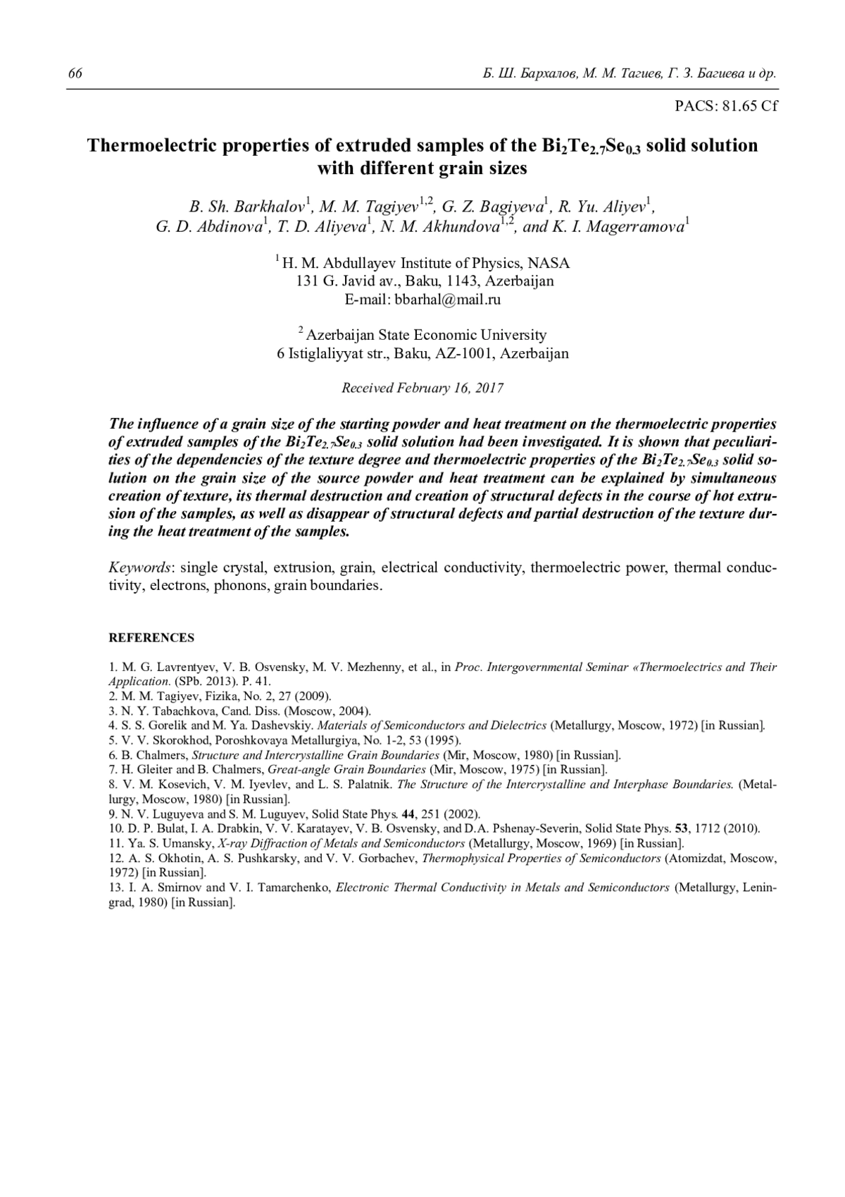 B. Sh. Barkhalov, M. M. Tagiyev, G. Z. Bagiyeva, R. Yu. Aliyev, G. D. Abdinova, T. D. Aliyeva, N. M. Akhundova, and K. I. Mag-erramova Thermoelectric properties of extruded samples of the Bi2Te2.7Se0.3 solid solution with different grain sizes 62