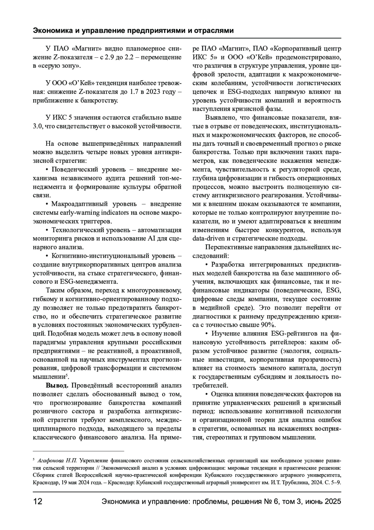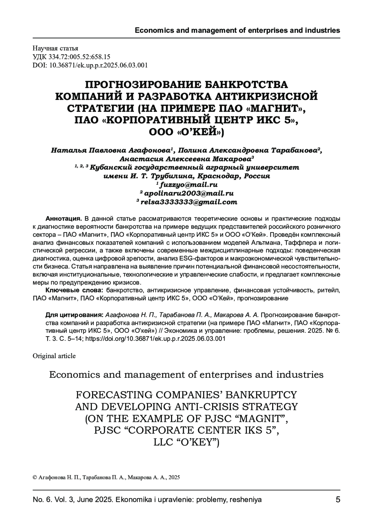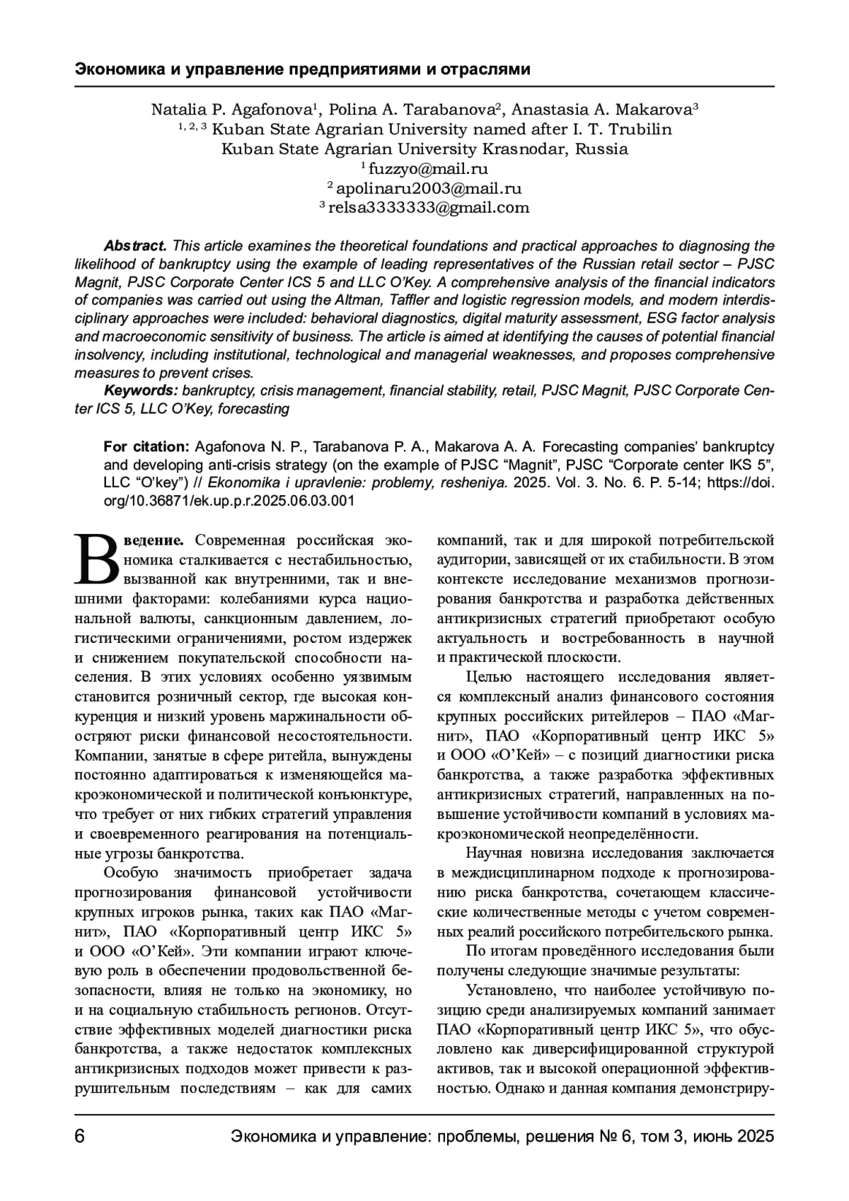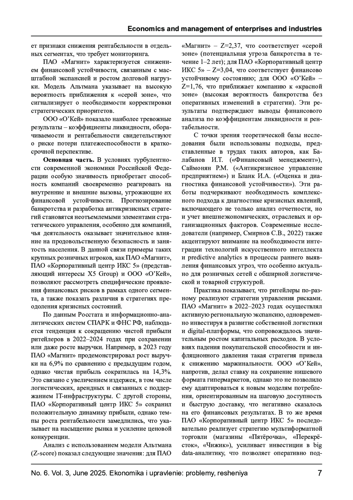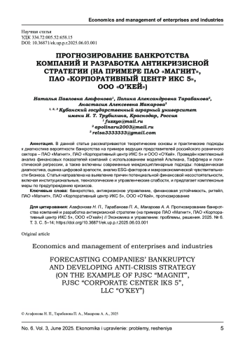В данной статье рассматриваются теоретические основы и практические подходы к диагностике вероятности банкротства на примере ведущих представителей российского розничного сектора - ПАО «Магнит», ПАО «Корпоративный центр ИКС 5» и ООО «О’Кей». Проведён комплексный анализ финансовых показателей компаний с использованием моделей Альтмана, Таффлера и логистической регрессии, а также включены современные междисциплинарные подходы: поведенческая диагностика, оценка цифровой зрелости, анализ ESG-факторов и макроэкономической чувствительности бизнеса. Статья направлена на выявление причин потенциальной финансовой несостоятельности, включая институциональные, технологические и управленческие слабости, и предлагает комплексные меры по предупреждению кризисов.