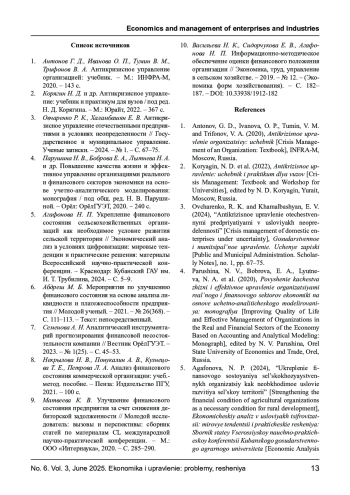 3. Овчаренко Р. К., Халамбашян Е. В. Антикризисное управление отечественными предприятиями в условиях неопределенности // Государственное и муниципальное управление. Ученые записки. - 2024. - № 1. - С. 67-75. EDN: ZNRLHM