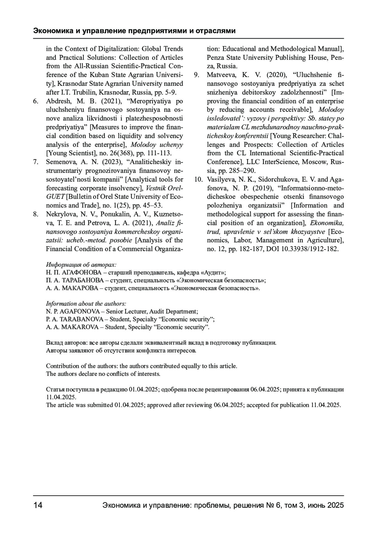5. Агафонова Н. П. Укрепление финансового состояния сельскохозяйственных организаций как необходимое условие развития сельской территории // Экономический анализ в условиях цифровизации: мировые тенденции и практические решения: материалы Всероссийской научно-практической конференции. - Краснодар: Кубанский ГАУ им. И. Т. Трубилина, 2024. - С. 5-9. EDN: DQALBX