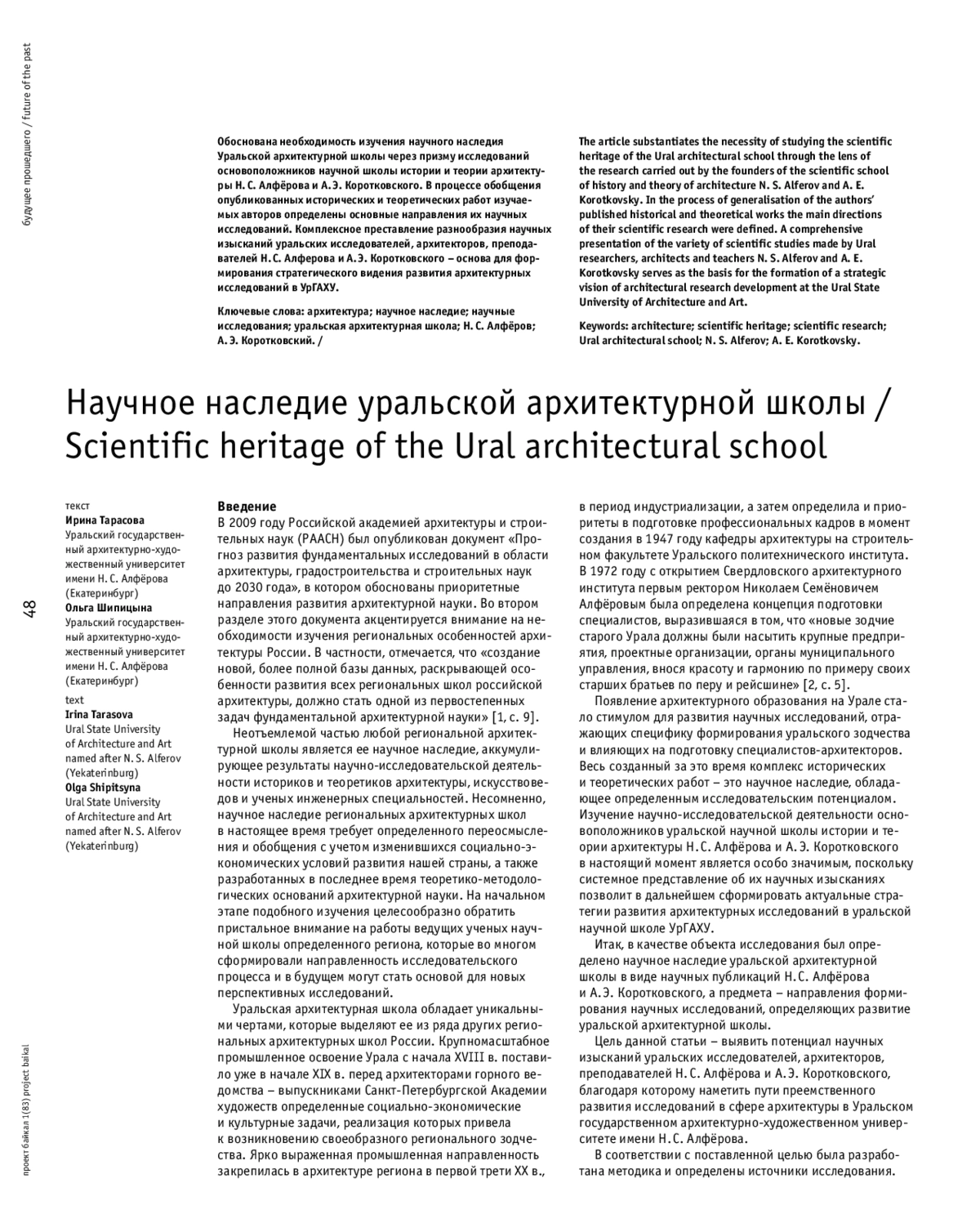 Обоснована необходимость изучения научного наследия Уральской архитектурной школы через призму исследований основоположников научной школы истории и теории архитектуры Н. С. Алфёрова и А. Э. Коротковского. В процессе обобщения опубликованных исторических и теоретических работ изучаемых авторов определены основные направления их научных исследований. Комплексное преставление разнообразия научных изысканий уральских исследователей, архитекторов, преподавателей Н. С. Алферова и А. Э. Коротковского – основа для формирования стратегического видения развития архитектурных исследований в УрГАХУ.