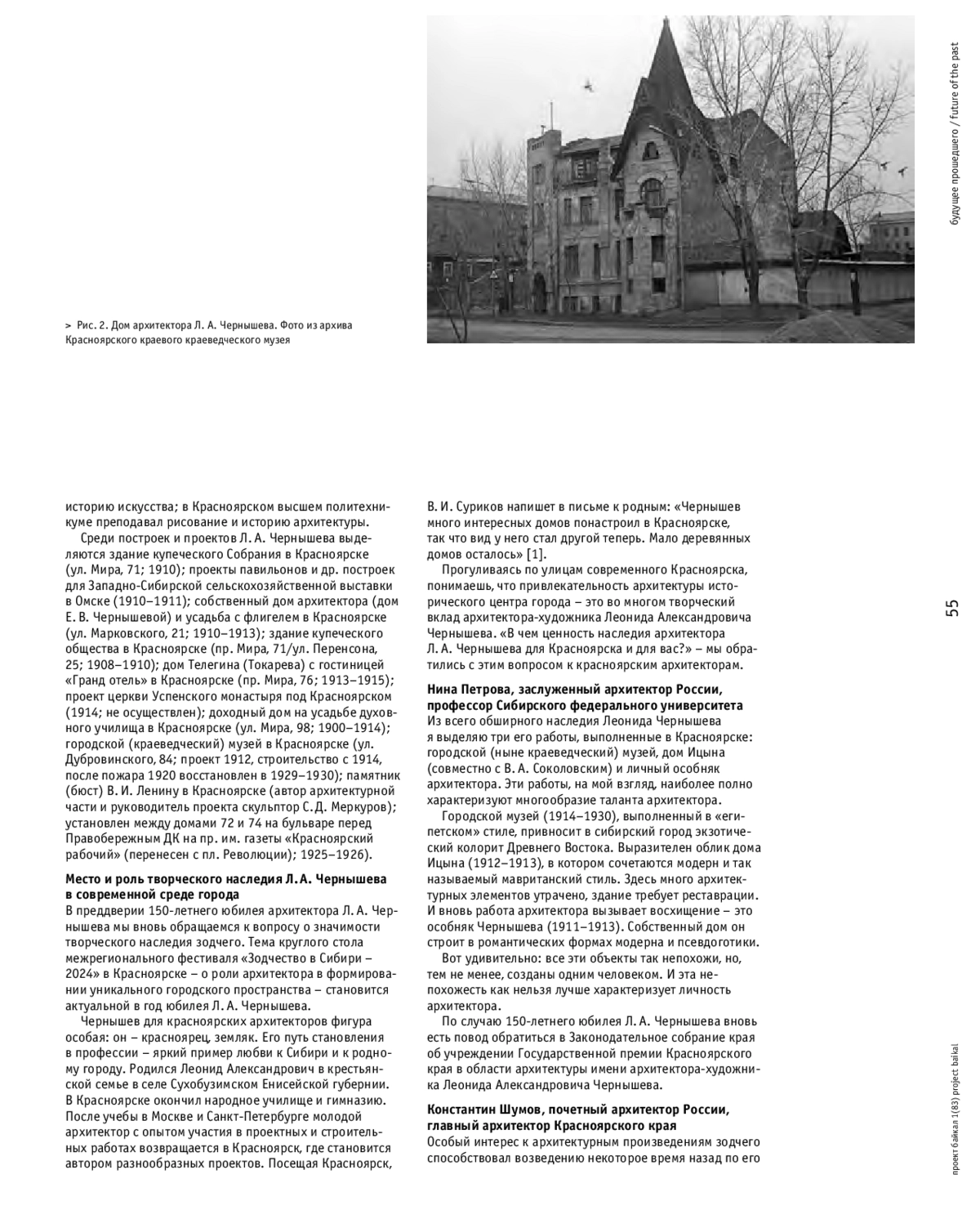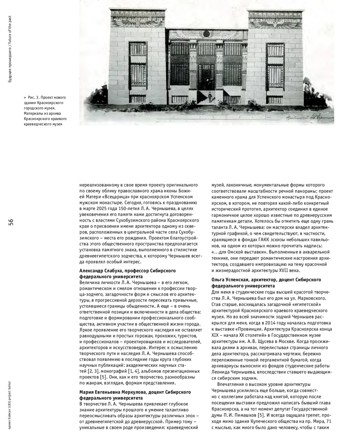 2. Меркулова, М. Е. Архитектор Л. А. Чернышев. Штрихи к творческой биографии: [об известном красноярском архитекторе] //Архитектурное наследие Сибири: материалы Всероссийской (с международным участием) научно-практической конференции, посвященной Международному дню памятников и исторических мест, 18 апреля 2015 г. - Красноярск: СФУ, 2015. - С. 55-59.