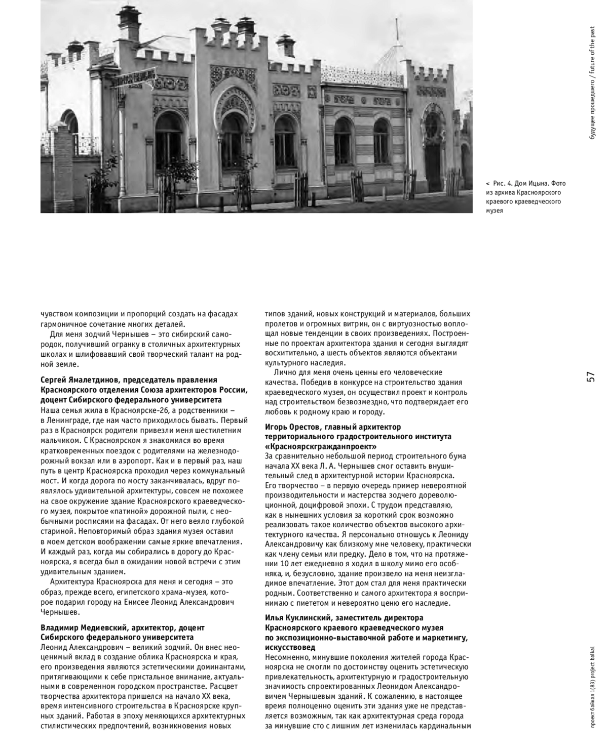 Kuklinsky, I. V. (2019). Krasnoyarsk architect Leonid Chernyshev. In M. Yaroshevskaya & I. V. Kuklinsky (Eds.), Krasnoyarsk Regional Museum of Local Lore. Krasnoyarsk: Polikor Publishing House.