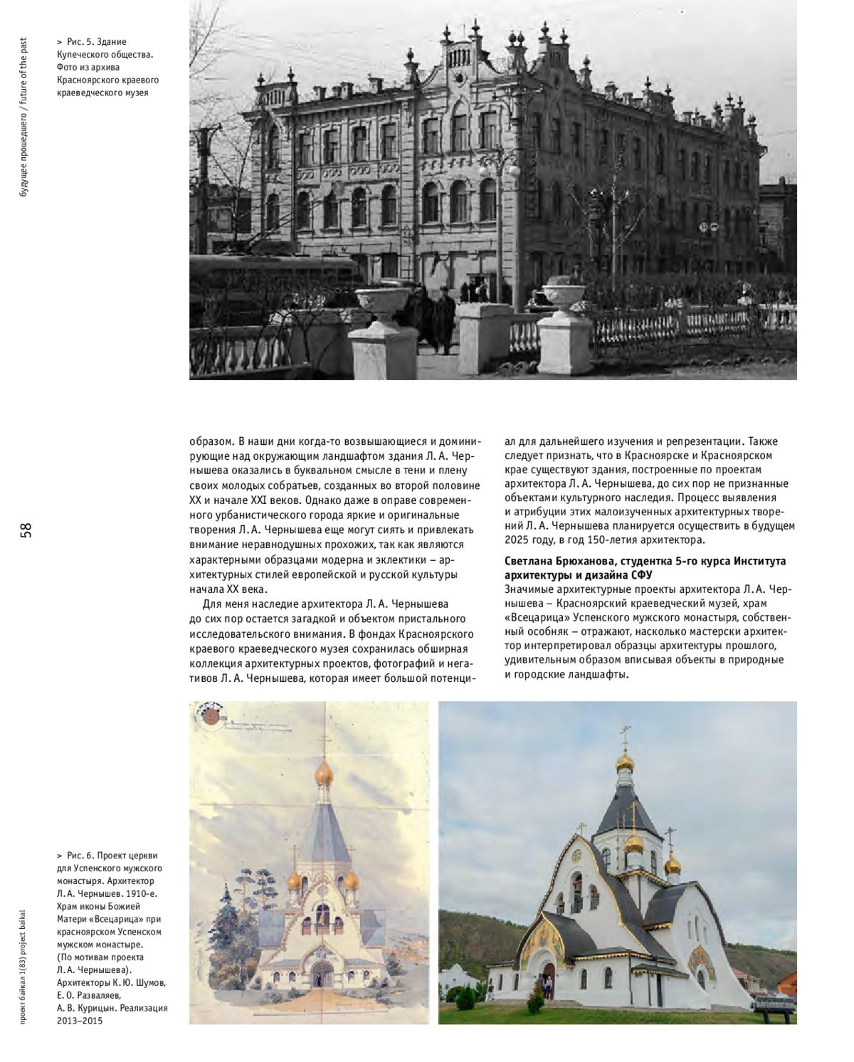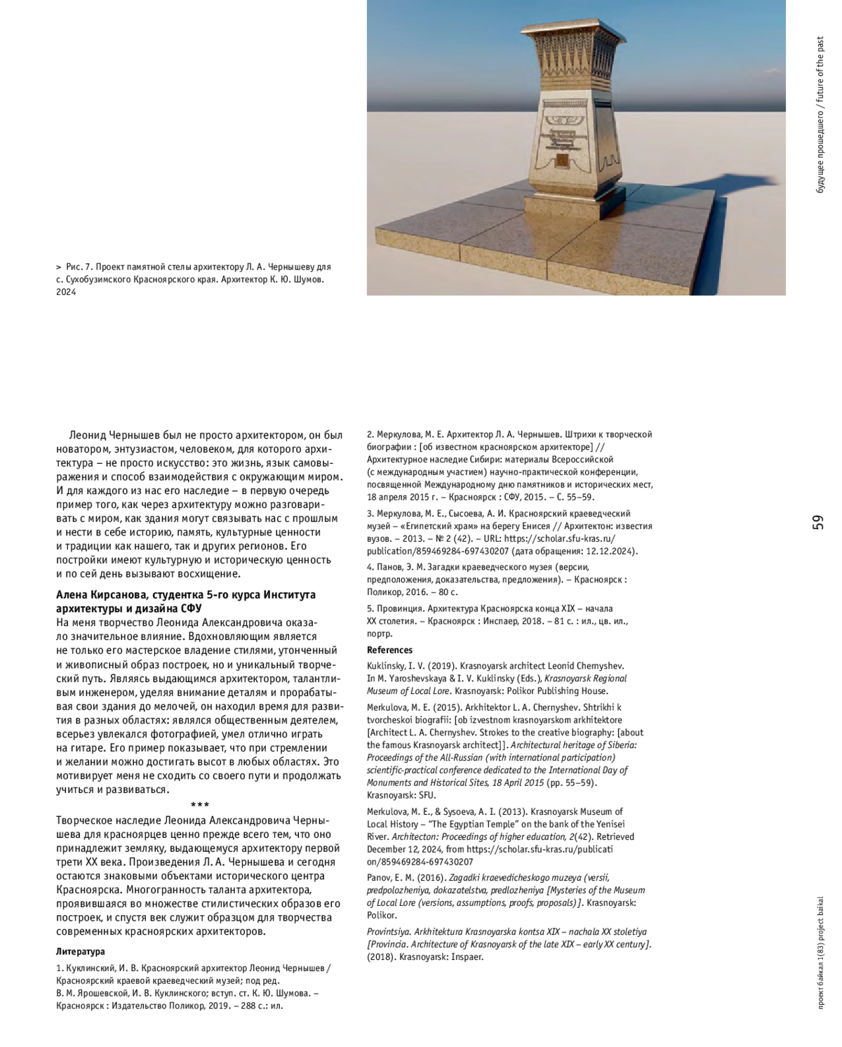 Merkulova, M. E. (2015). Arkhitektor L. A. Chernyshev. Shtrikhi k tvorcheskoi biografii: [ob izvestnom krasnoyarskom arkhitektore [Architect L. A. Chernyshev. Strokes to the creative biography: [about the famous Krasnoyarsk architect]]. Architectural heritage of Siberia: Proceedings of the All-Russian (with international participation) scientific-practical conference dedicated to the International Day of Monuments and Historical Sites, 18 April 2015 (pp. 55-59). Krasnoyarsk: SFU.