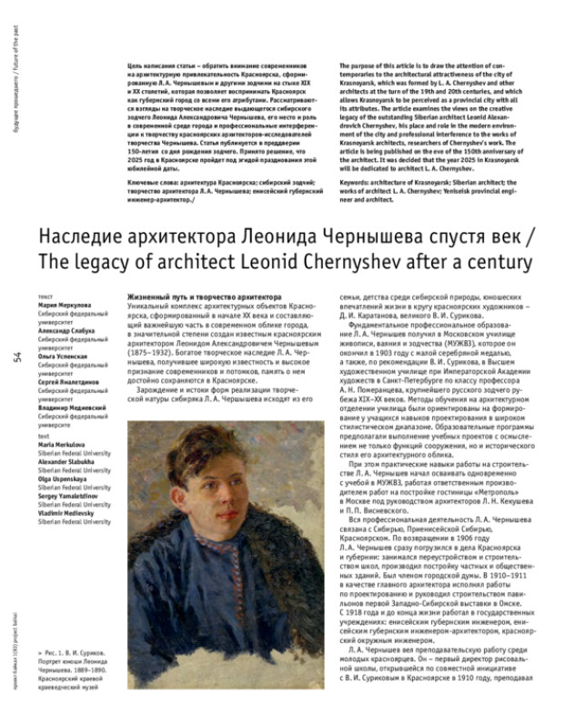 Цель написания статьи – обратить внимание современников на архитектурную привлекательность Красноярска, сформированную Л. А. Чернышевым и другими зодчими на стыке XIX и XX столетий, которая позволяет воспринимать Красноярск как губернский город со всеми его атрибутами. Рассматриваются взгляды на творческое наследие выдающегося сибирского зодчего Леонида Александровича Чернышева, его место и роль в современной среде города и профессиональные интерференции к творчеству красноярских архитекторов-исследователей творчества Чернышева. Статья публикуется в преддверии 150-летия со дня рождения зодчего. Принято решение, что 2025 год в Красноярске пройдет под эгидой празднования этой юбилейной даты.