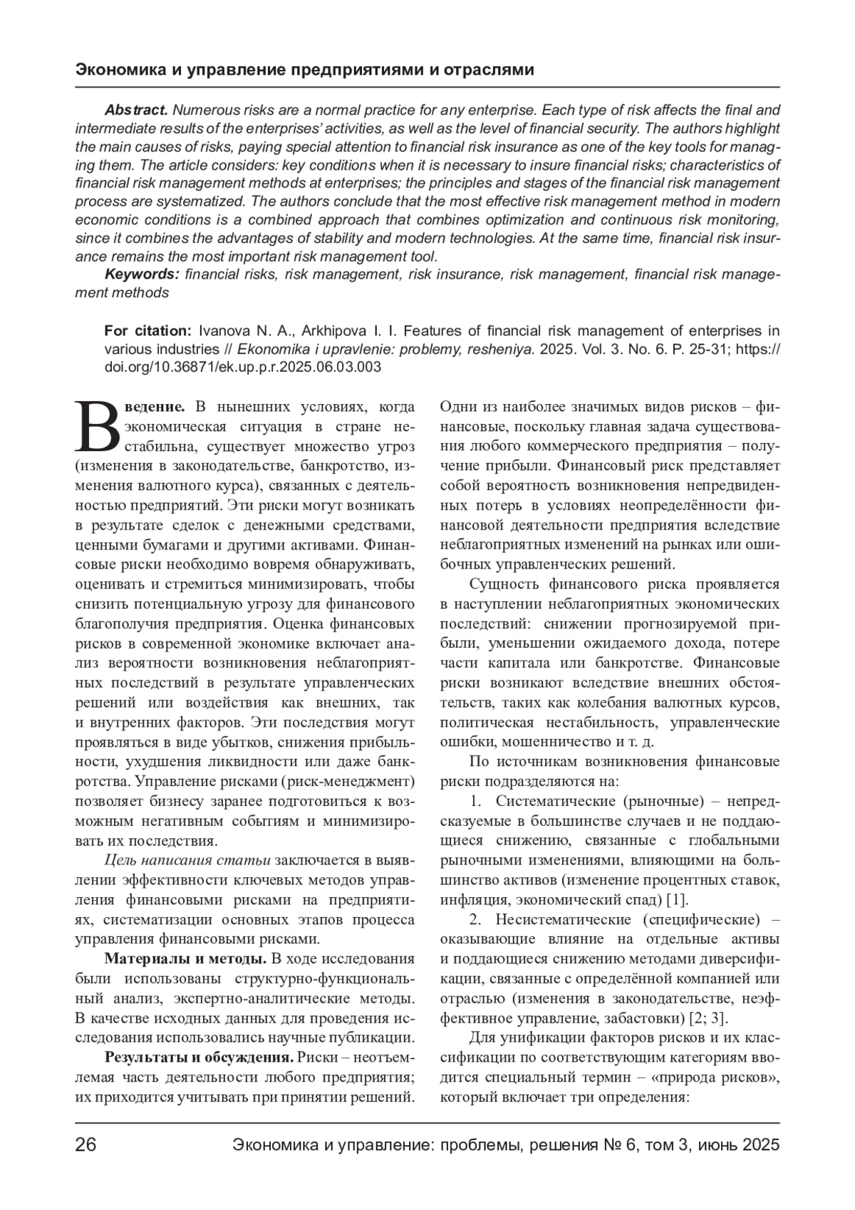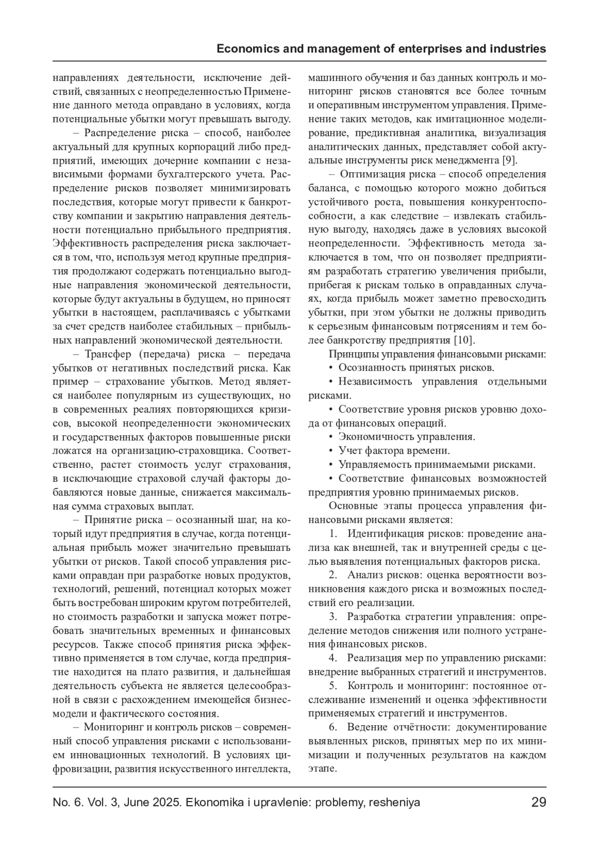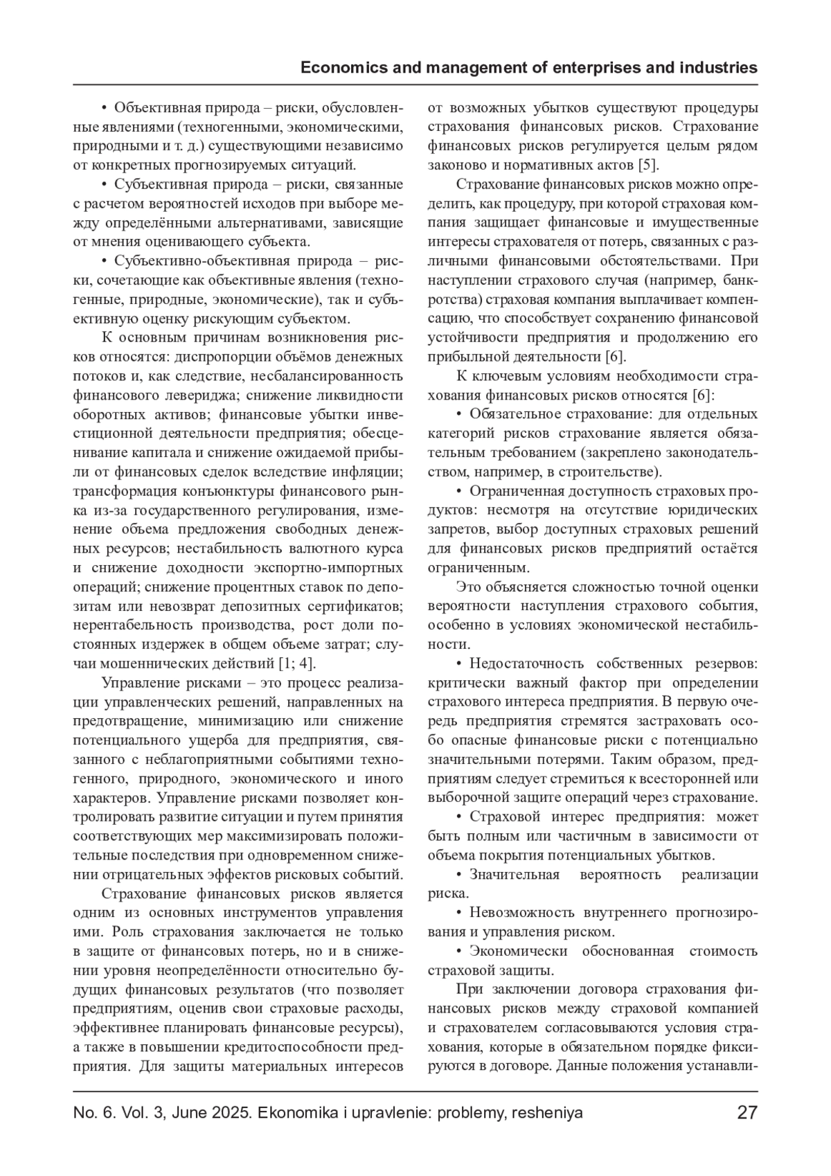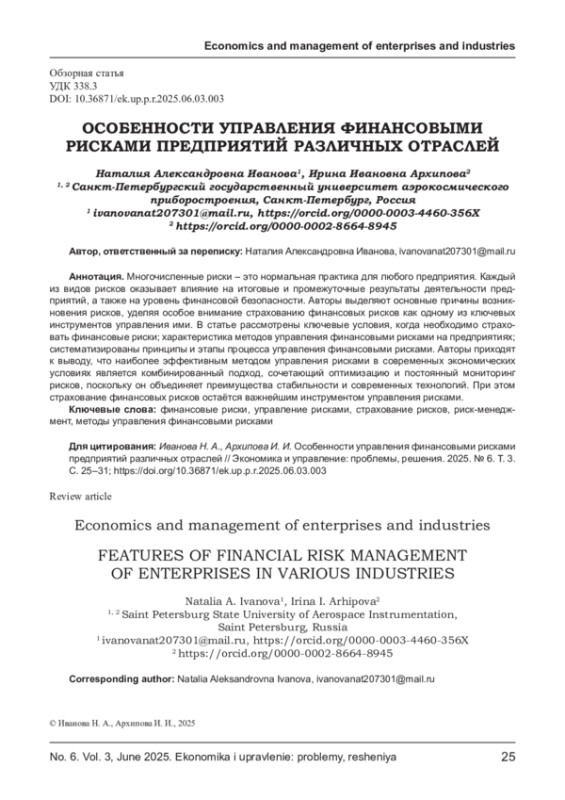 Многочисленные риски - это нормальная практика для любого предприятия. Каждый из видов рисков оказывает влияние на итоговые и промежуточные результаты деятельности предприятий, а также на уровень финансовой безопасности. Авторы выделяют основные причины возникновения рисков, уделяя особое внимание страхованию финансовых рисков как одному из ключевых инструментов управления ими. В статье рассмотрены ключевые условия, когда необходимо страховать финансовые риски; характеристика методов управления финансовыми рисками на предприятиях; систематизированы принципы и этапы процесса управления финансовыми рисками. Авторы приходят к выводу, что наиболее эффективным методом управления рисками в современных экономических условиях является комбинированный подход, сочетающий оптимизацию и постоянный мониторинг рисков, поскольку он объединяет преимущества стабильности и современных технологий. При этом страхование финансовых рисков остаётся важнейшим инструментом управления рисками.
