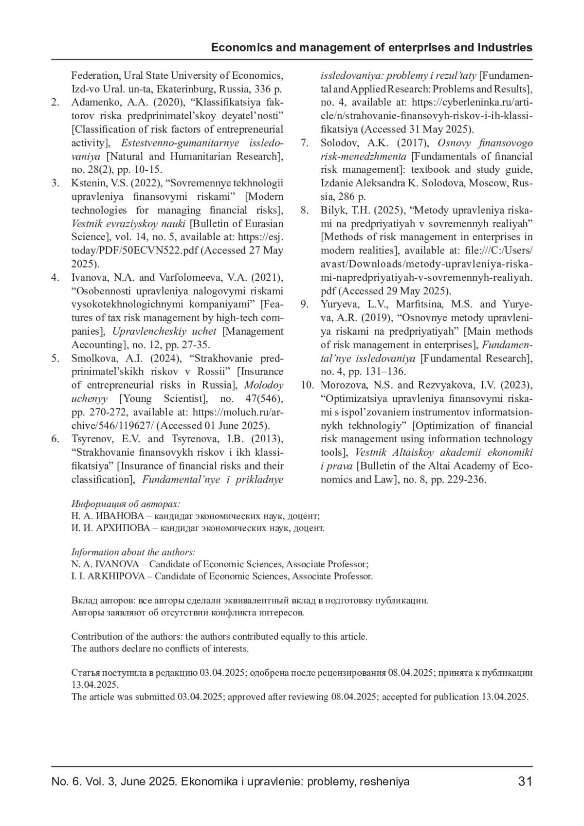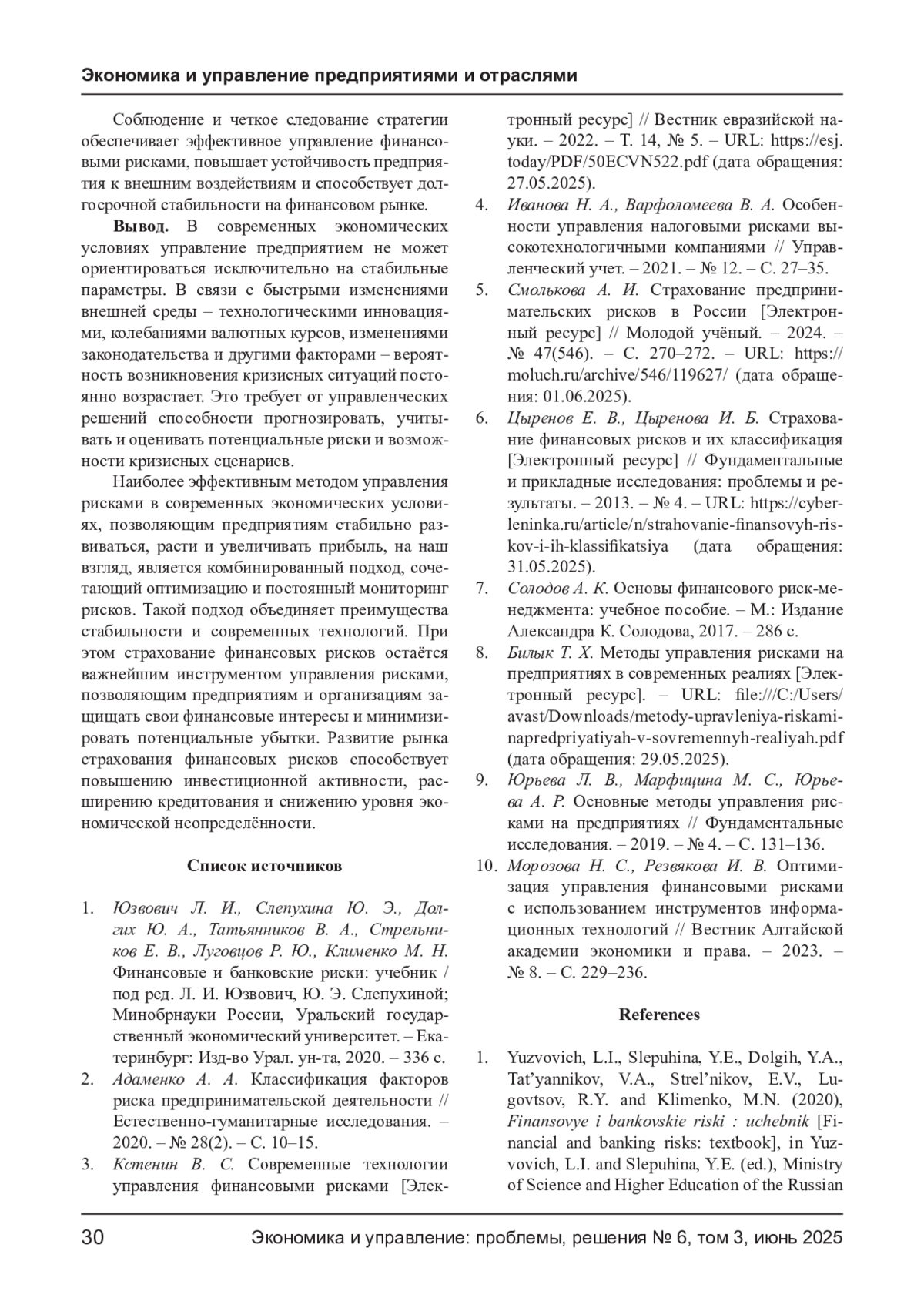 10. Морозова Н. С., Резвякова И. В. Оптимизация управления финансовыми рисками с использованием инструментов информационных технологий // Вестник Алтайской академии экономики и права. - 2023. - № 8. - С. 229-236. EDN: OKDMUG