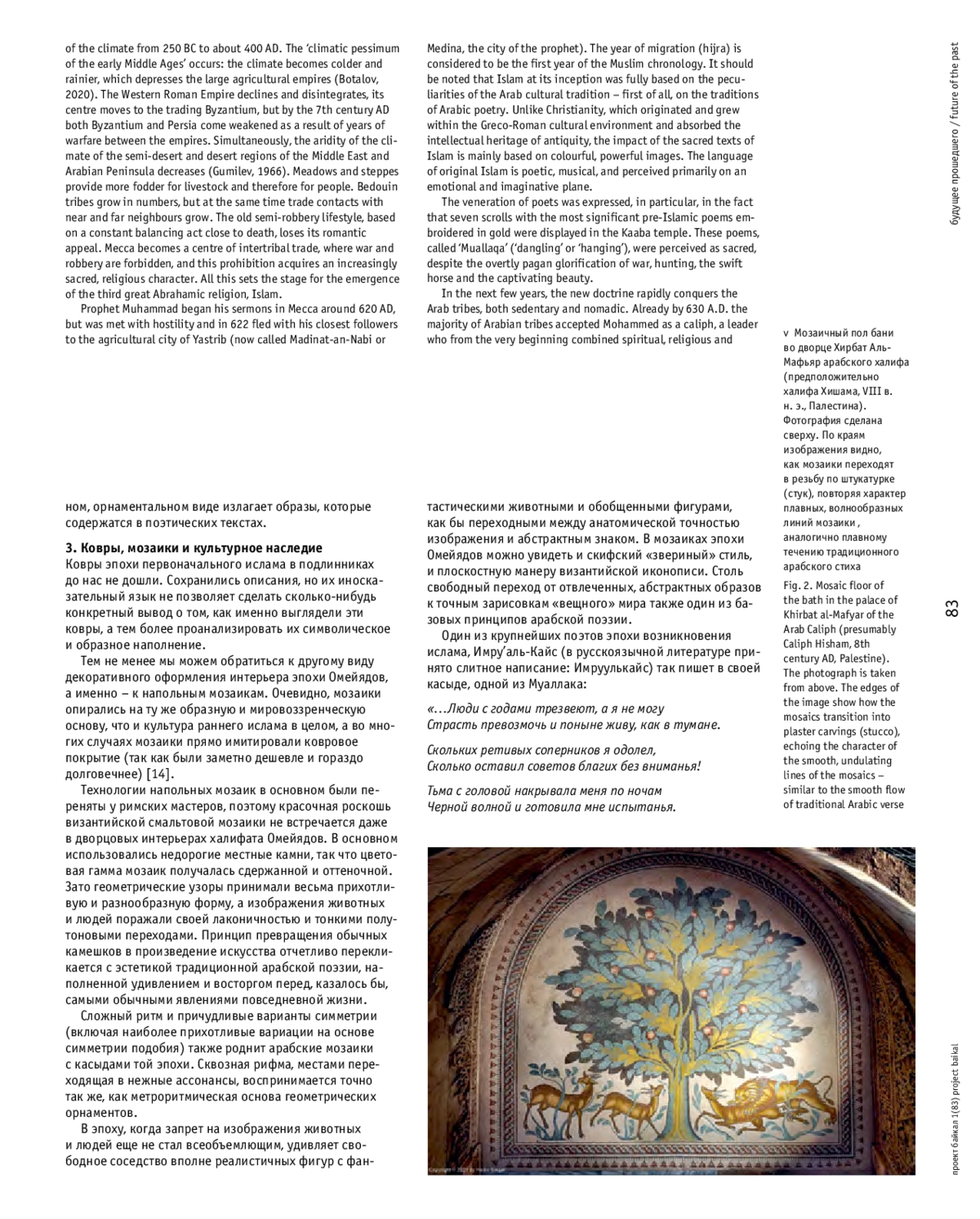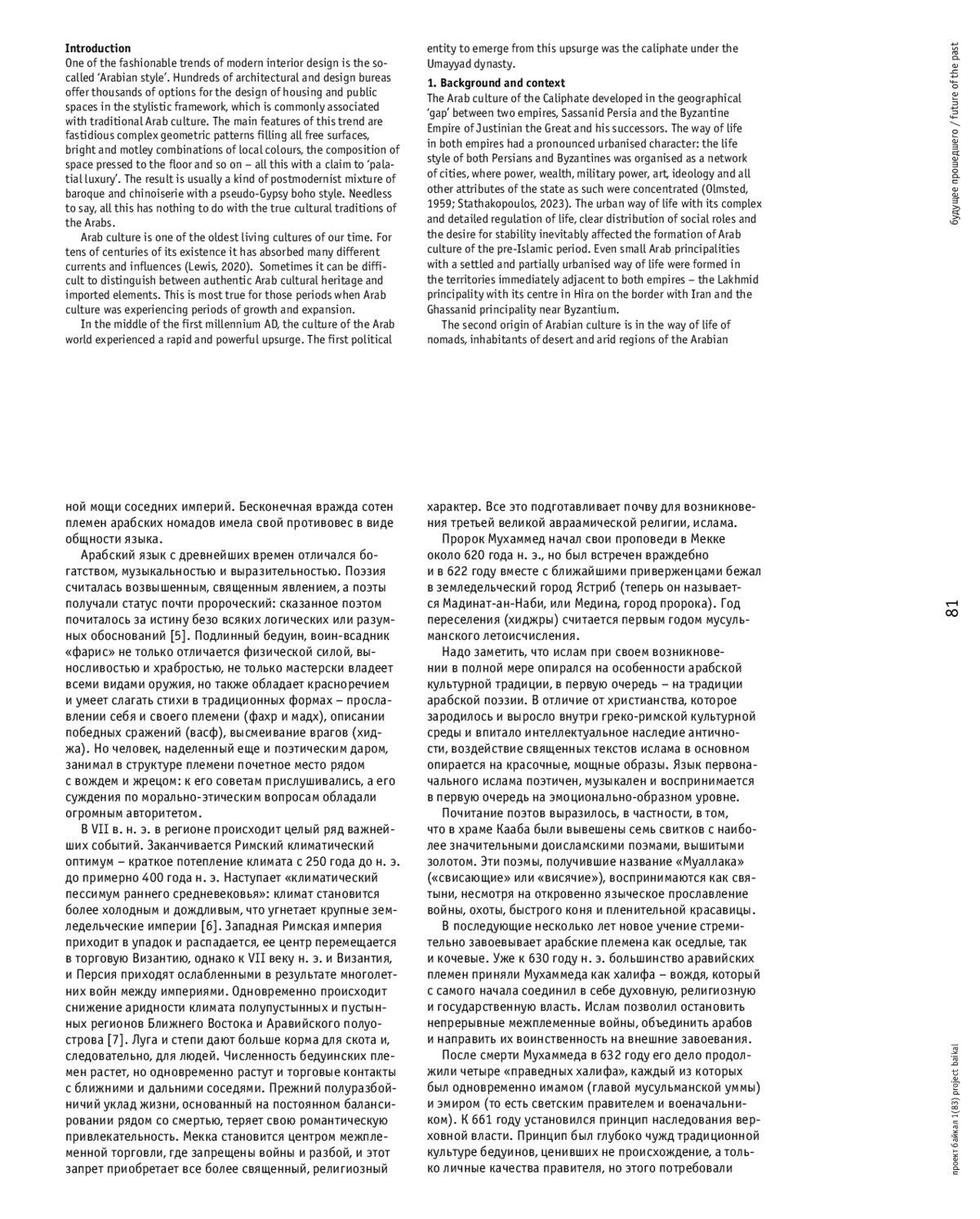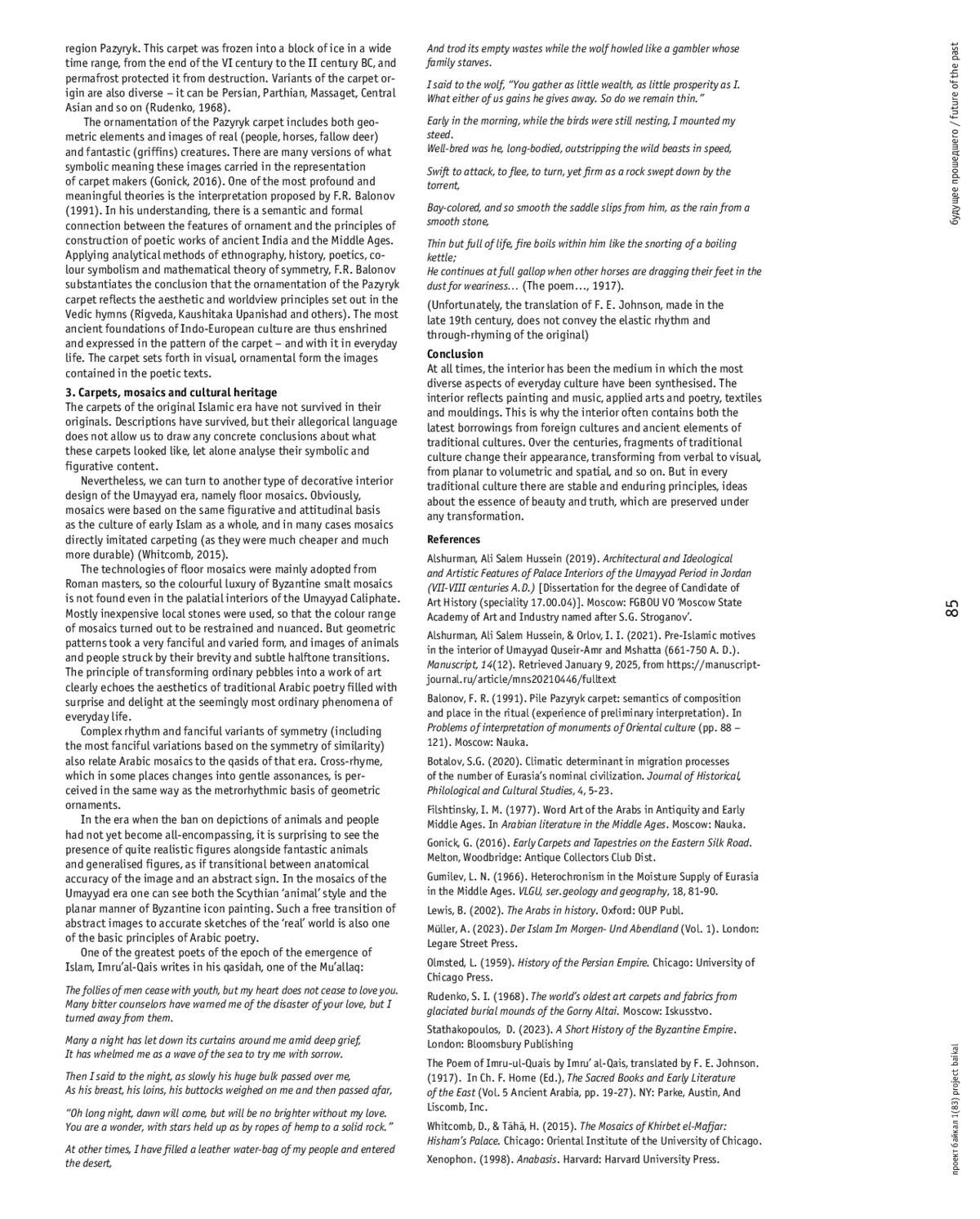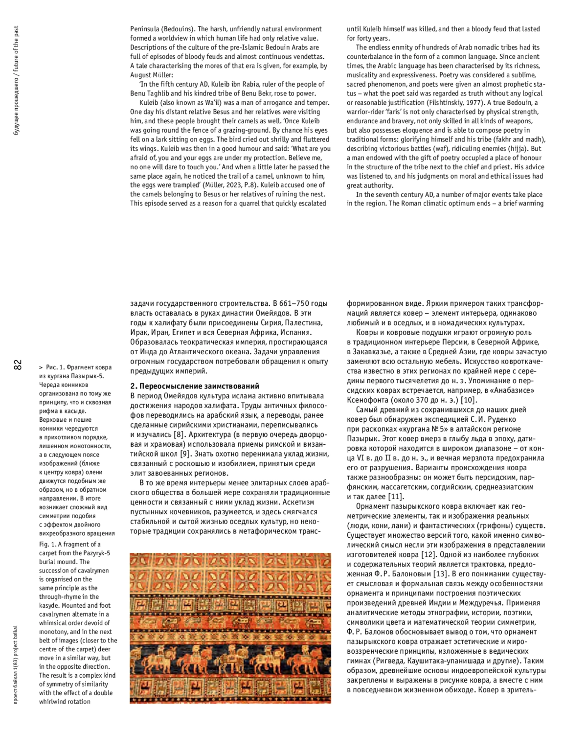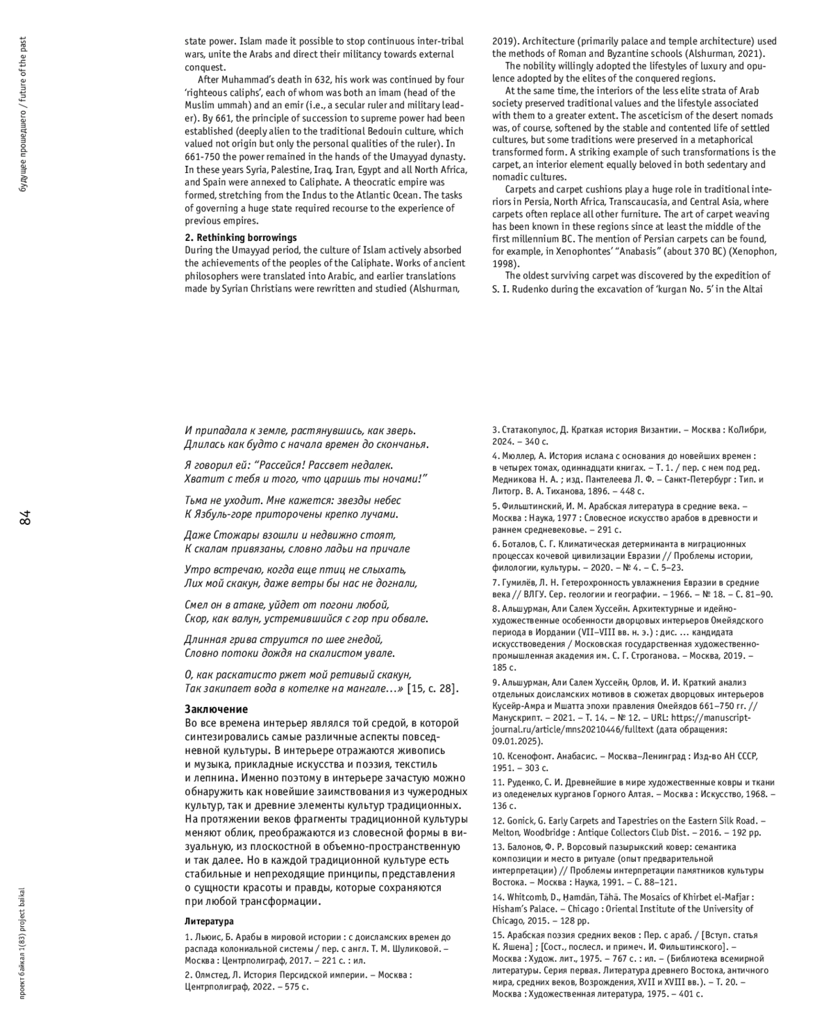 Рассмотрены некоторые аспекты культуры эпохи Омейядов. Несмотря на активное взаимодействие ранней исламской культуры с культурами Персии, Византии, Рима и Средней Азии, традиционная арабская поэзия остается объектом глубокого почитания. Основные этико-эстетические принципы арабской поэзии трансформировались в приемы оформления жилых, дворцовых и храмовых интерьеров. Эти принципы можно проследить в мотивах арабского текстиля, в частности ковров. Сделан вывод о том, что традиционная культура может сохраняться в некоторых элементах интерьера, несмотря на значительные внешние изменения.