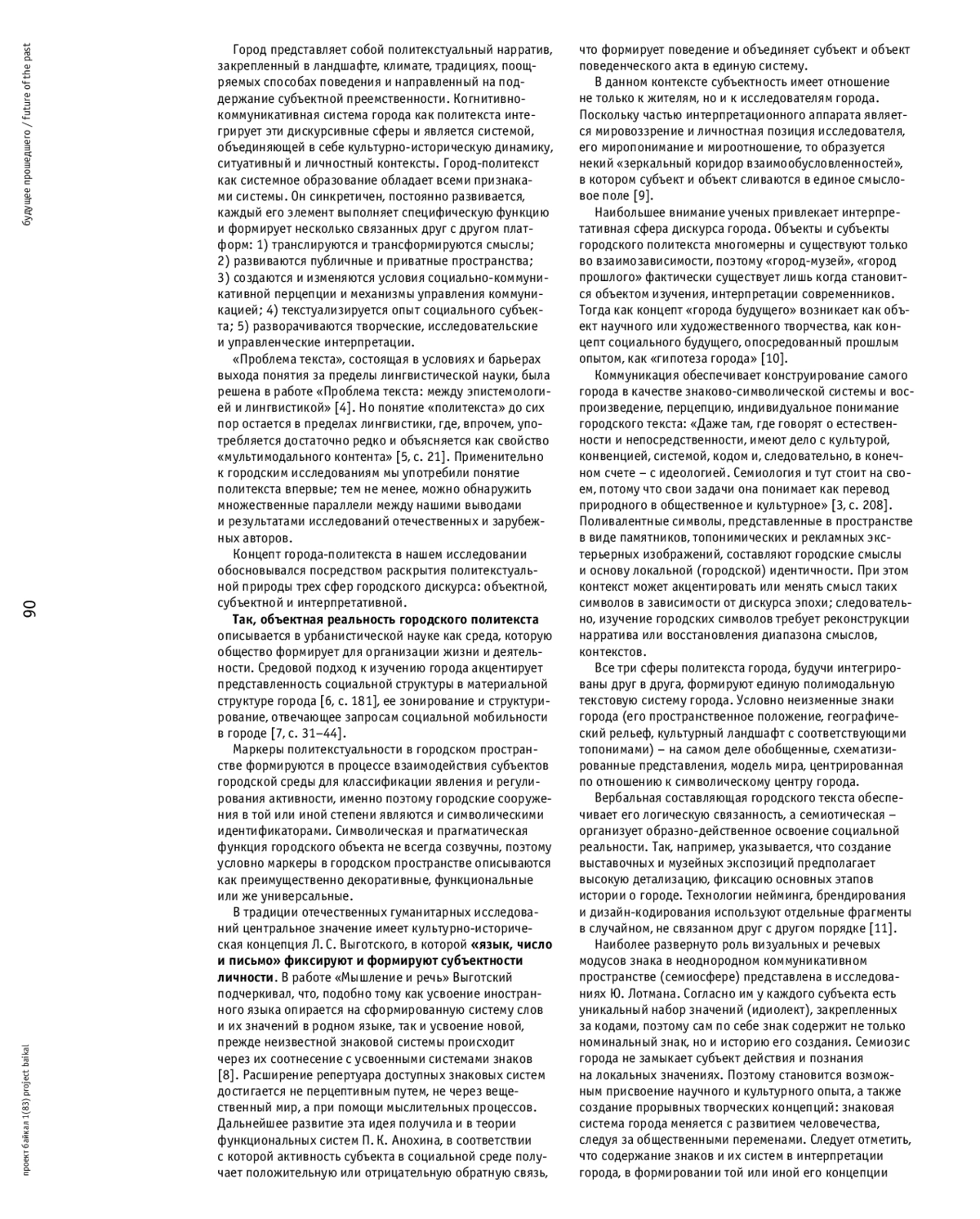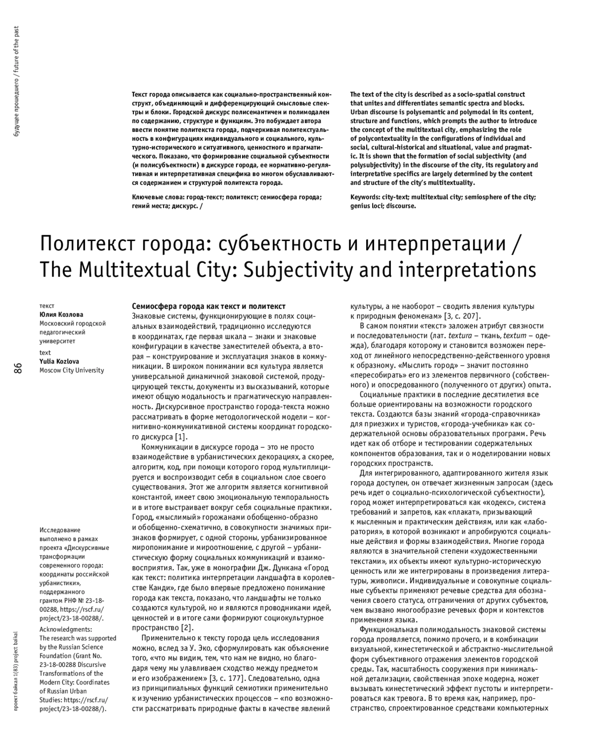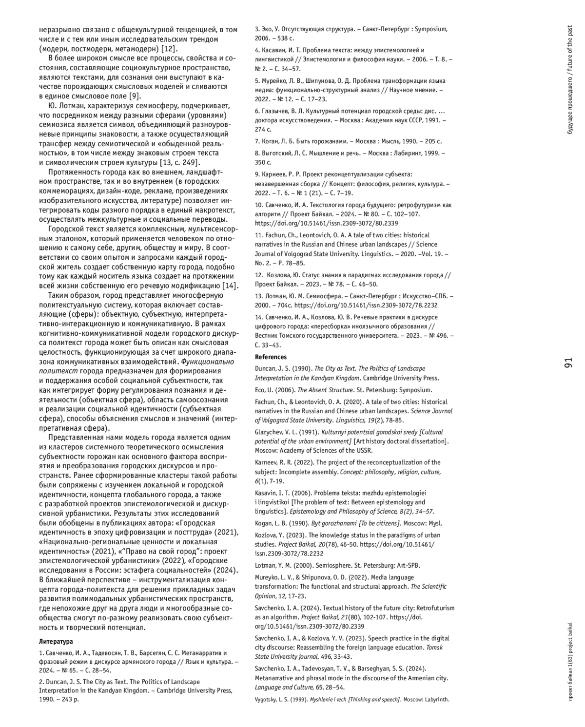 12. Козлова, Ю. Статус знания в парадигмах исследования города // Проект Байкал. - 2023. - № 78. - С. 46-50.