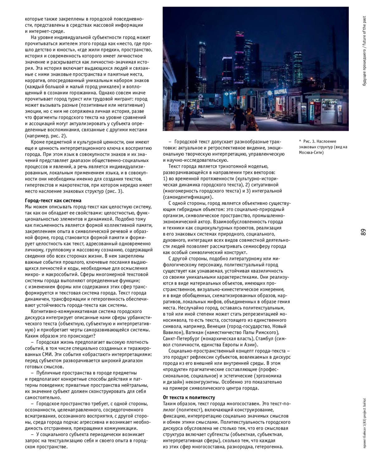 Текст города описывается как социально-пространственный конструкт, объединяющий и дифференцирующий смысловые спектры и блоки. Городской дискурс полисемантичен и полимодален по содержанию, структуре и функциям. Это побуждает автора ввести понятие политекста города, подчеркивая политекстуальность в конфигурациях индивидуального и социального, культурно-исторического и ситуативного, ценностного и прагматического. Показано, что формирование социальной субъектности (и полисубъектности) в дискурсе города, ее нормативно-регулятивная и интерпретативная специфика во многом обуславливаются содержанием и структурой политекста города.