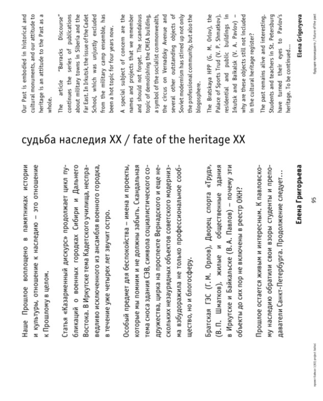 Статья «Казарменный дискурс» продолжает цикл публикаций о военных городках Сибири и Дальнего Востока. В Иркутске тема Кадетского училища, несправедливо исключенного из ансамбля военного городка, в течение уже четырех лет звучит остро.