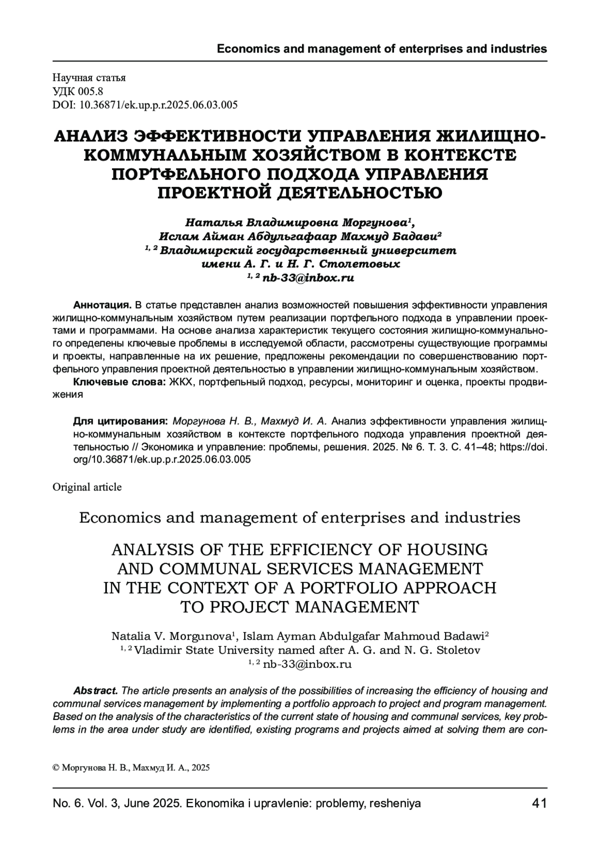 В статье представлен анализ возможностей повышения эффективности управления жилищно-коммунальным хозяйством путем реализации портфельного подхода в управлении проектами и программами. На основе анализа характеристик текущего состояния жилищно-коммунального определены ключевые проблемы в исследуемой области, рассмотрены существующие программы и проекты, направленные на их решение, предложены рекомендации по совершенствованию портфельного управления проектной деятельностью в управлении жилищно-коммунальным хозяйством.