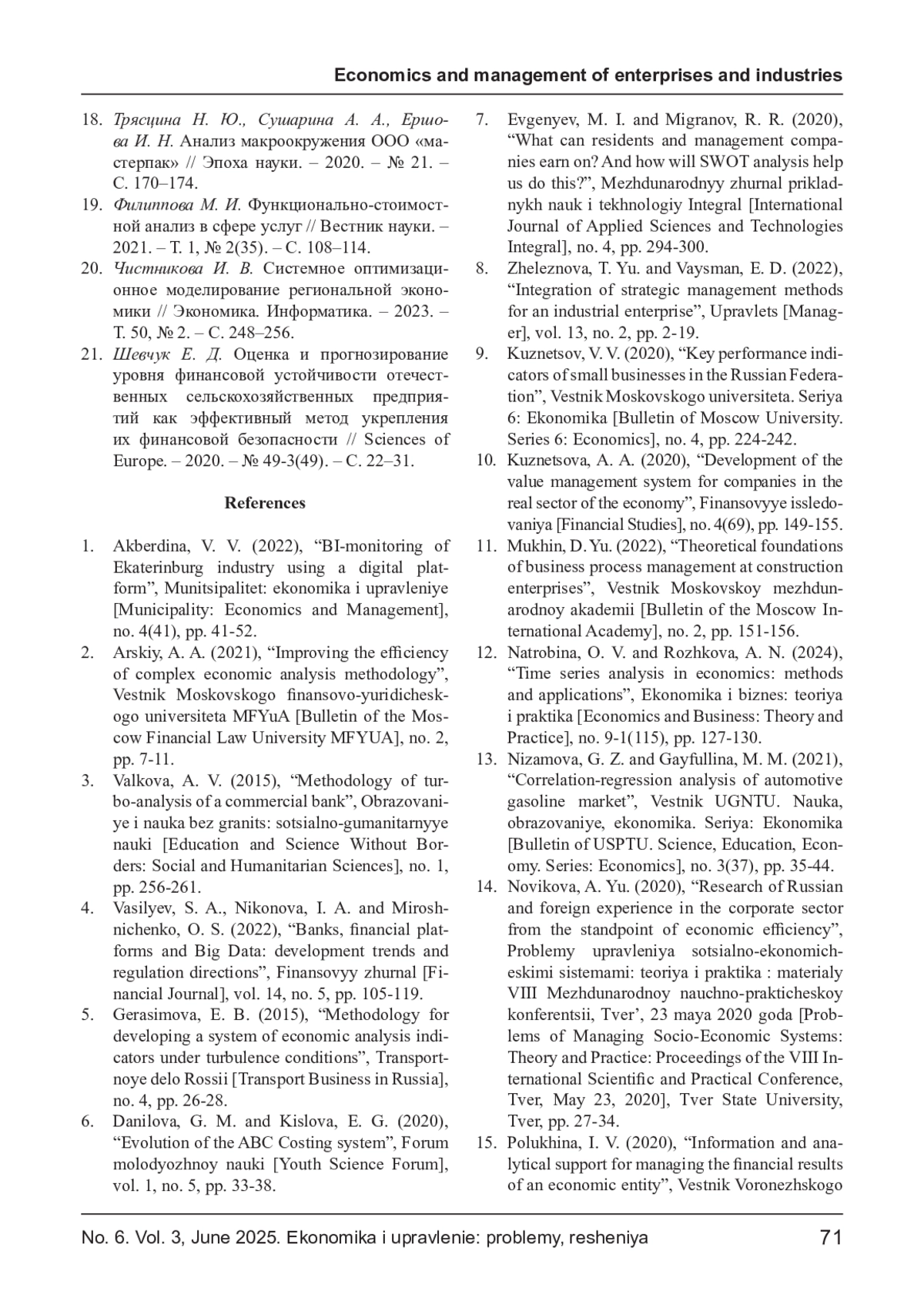 2. Арский А. А. Повышение эффективности методики комплексного экономического анализа // Вестник Московского финансово-юридического университета МФЮА. - 2021. - № 2. - С. 7-11. EDN: XXNTCM