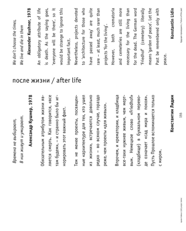 Два дискурса – «Future in the Past» и «Future of the Past» – раскрывают суть процессов взаимодействия прошлого, настоящего и предстоящего, существования наследия, возможности его сохранения как системы айдентики, встраивания в современную жизнь. Они позволяют спрогнозировать то, что подлежит сохранению – будущую жизнь наследия, а также представить художественно-проектные реалии как прямые «забросы» в будущее, учитывают их способность постоянно пребывать в прошлом, настоящем и будущем, быть предвидением и реальностью одновременно.
