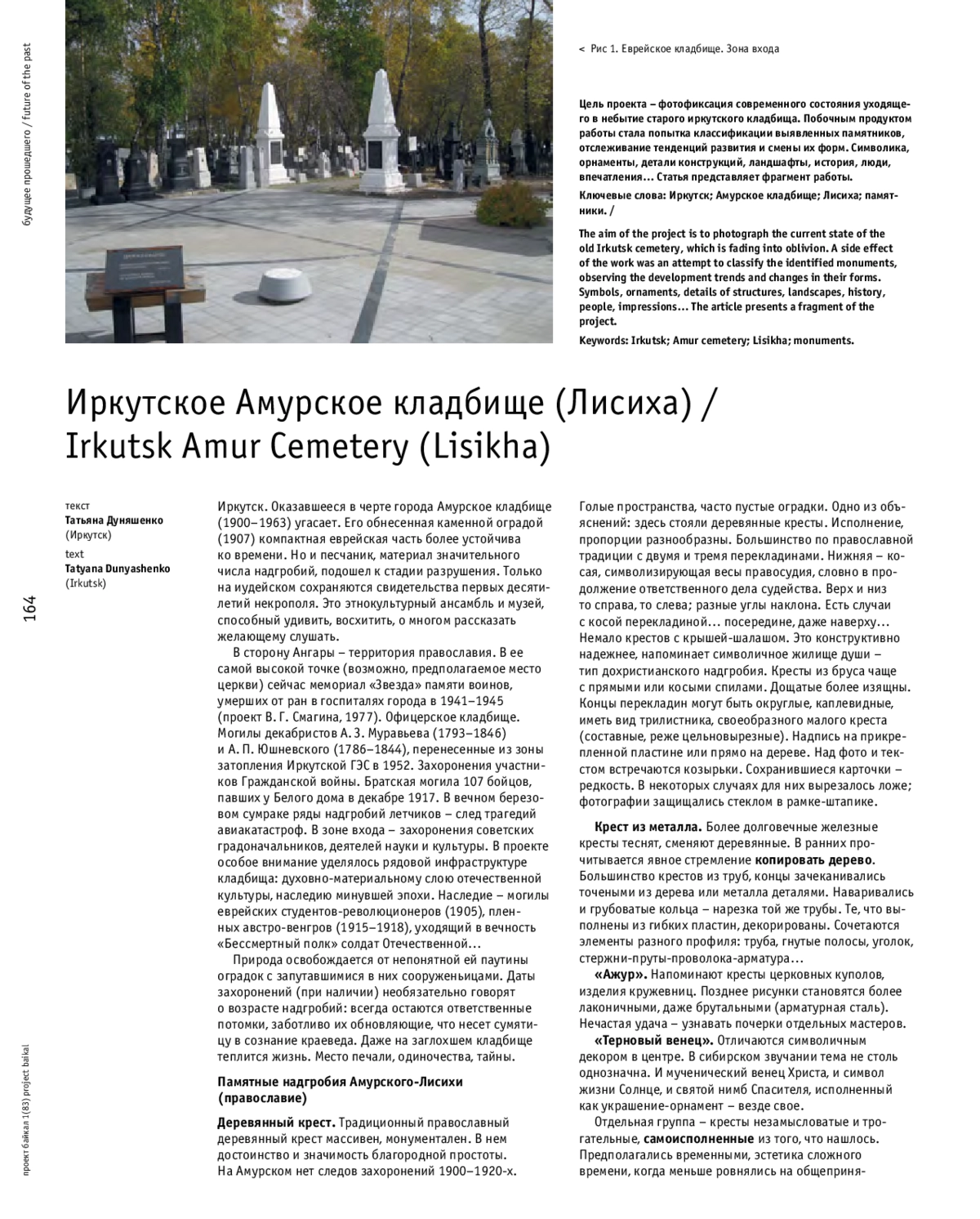 Цель проекта – фотофиксация современного состояния уходящего в небытие старого иркутского кладбища. Побочным продуктом работы стала попытка классификации выявленных памятников, отслеживание тенденций развития и смены их форм. Символика, орнаменты, детали конструкций, ландшафты, история, люди, впечатления… Статья представляет фрагмент работы.