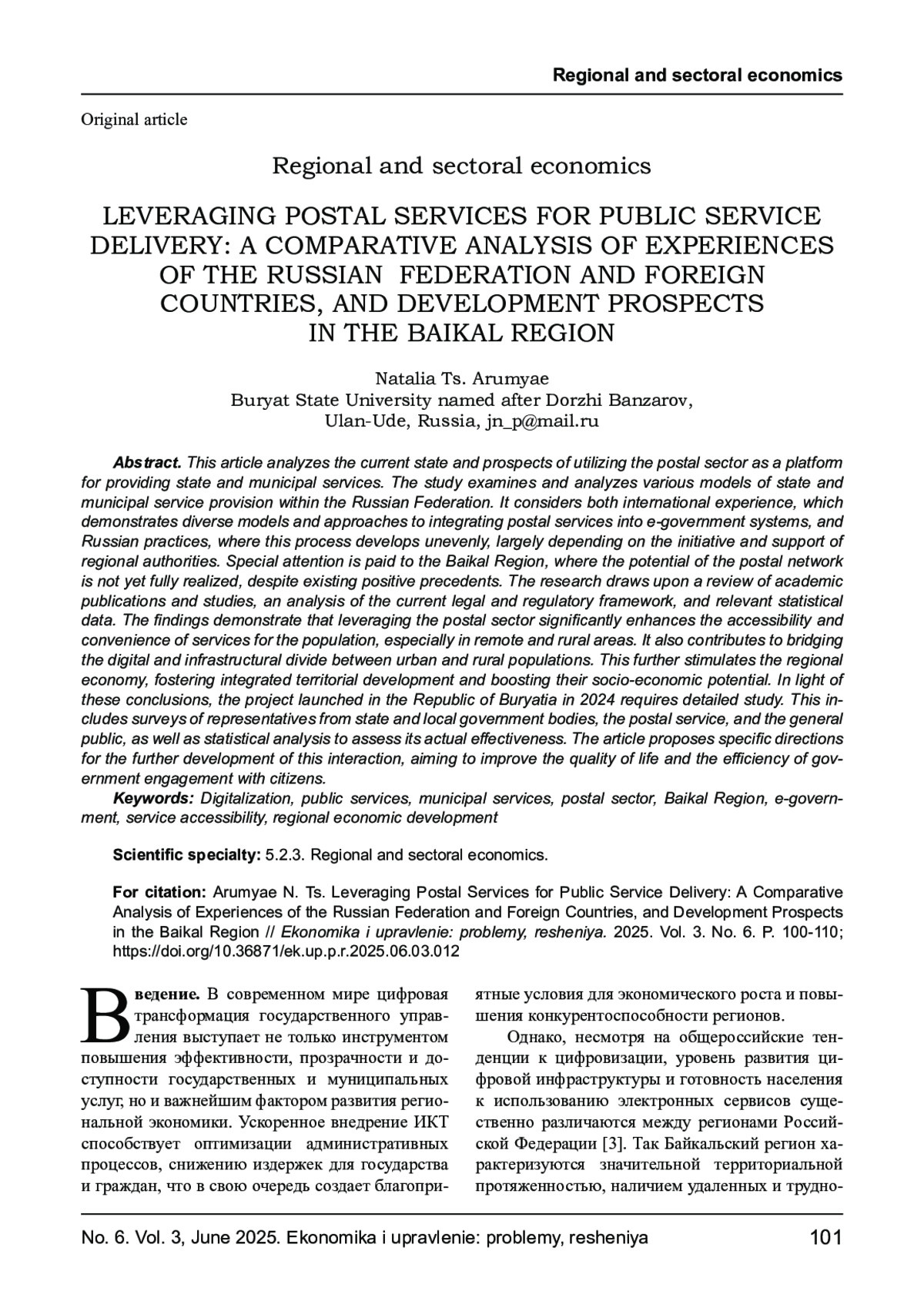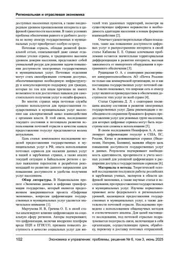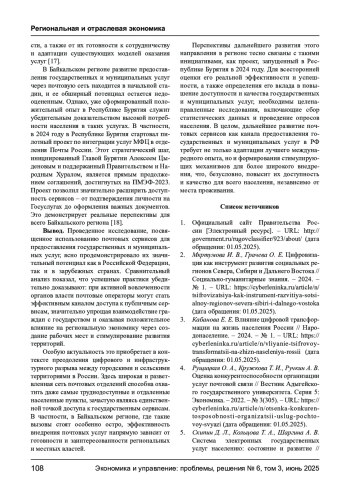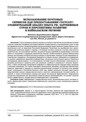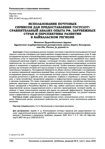 Статья посвящена анализу текущего состояния и перспектив использования почтовой отрасли в качестве платформы для предоставления государственных и муниципальных услуг. В ходе исследования изучены и проанализированы различные модели предоставления государственных и муниципальных услуг на территории Российской Федерации. Рассмотрен как зарубежный опыт, демонстрирующий различные модели и подходы к интеграции почтовых сервисов в систему электронного правительства, так и российская практика, где данный процесс развивается неравномерно, во многом завися от инициативы и поддержки региональных властей. Особое внимание уделено Байкальскому региону, где потенциал почтовой сети еще не раскрыт в полной мере, несмотря на уже имеющиеся положительные прецеденты. Исследование базируется на обзоре научных публикаций и исследований, на анализе современной нормативно-правовой базы, актуальных статистических данных. Результаты исследования демонстрируют, что использование почтовой отрасли обеспечивает значительное повышение доступности и удобства услуг для населения, особенно в отдалённых и сельских территориях, а также способствует преодолению цифрового и инфраструктурного разрыва между городским и сельским населением. Это также стимулирует региональную экономику, способствуя комплексному развитию территорий и повышая их социально-экономический потенциал. В контексте этих выводов проект, запущенный в Республике Бурятия в 2024 году, требует детального изучения через опросы представителей органов государственной власти и местного самоуправления, почтовой службы, населения. А также статистического анализа для оценки его реальной эффективности. Предлагаются конкретные направления для дальнейшего развития данного взаимодействия, что улучшит качество жизни и эффективность государственного взаимодействия с гражданами.