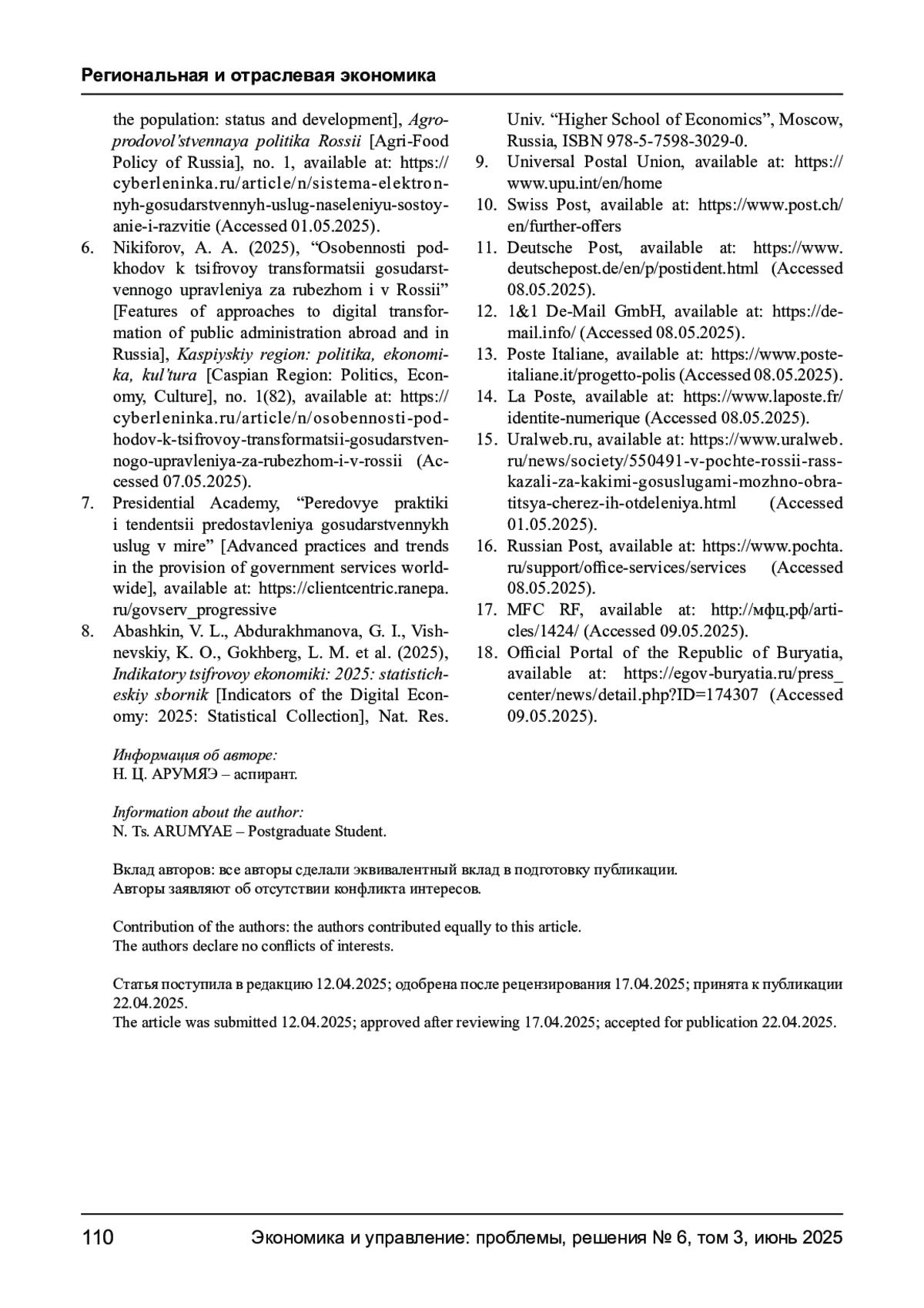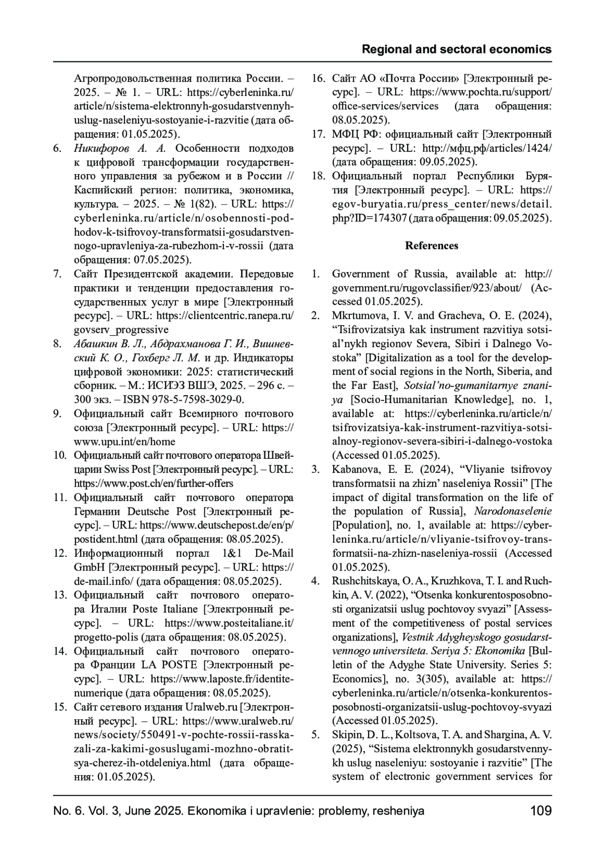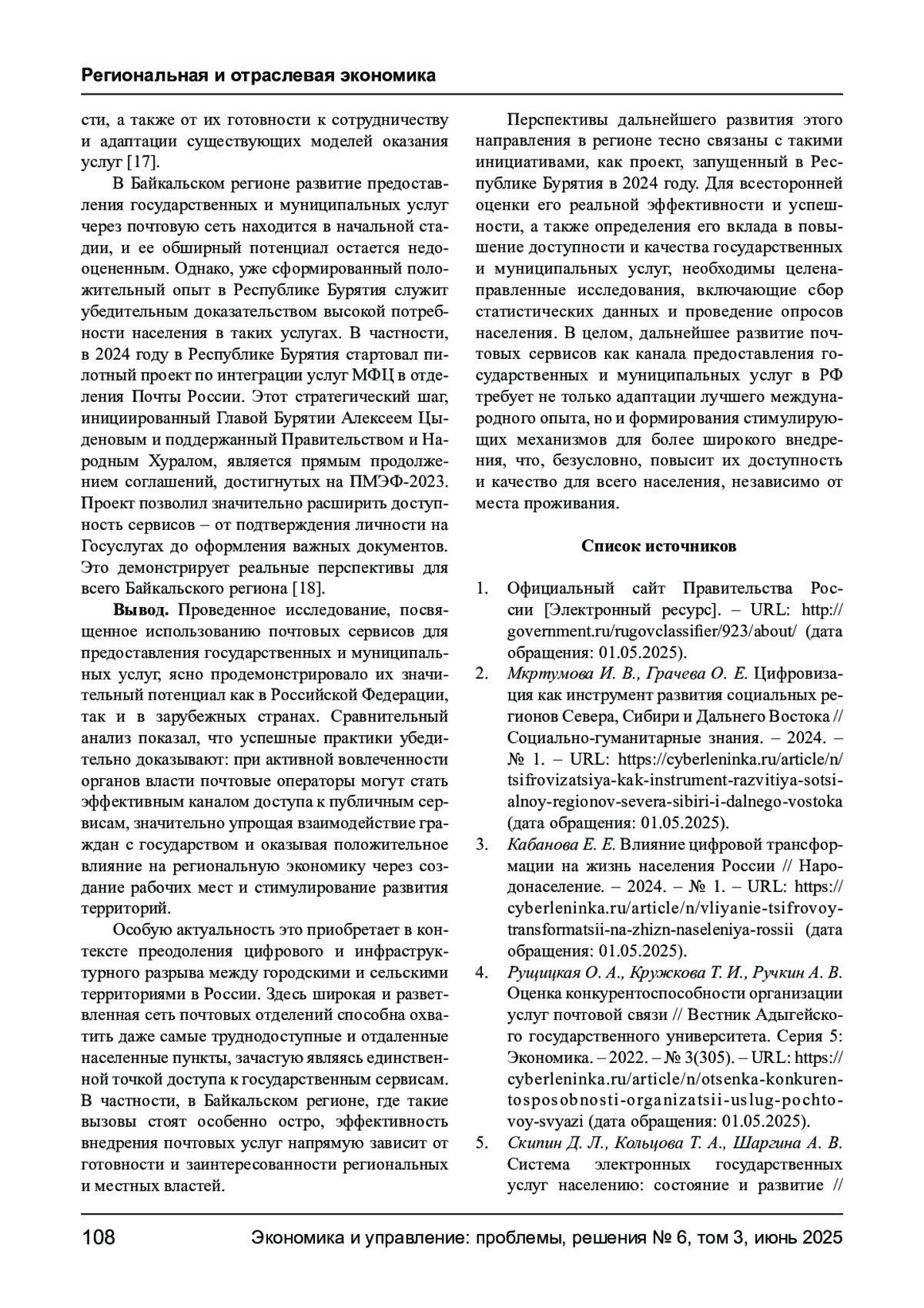 5. Скипин Д. Л., Кольцова Т. А., Шаргина А. В. Система электронных государственных услуг населению: состояние и развитие // Агропродовольственная политика России. - 2025. - № 1. - URL: https://cyberleninka.ru/article/n/sistema-elektronnyh-gosudarstvennyhuslug-naseleniyu-sostoyanie-i-razvitie (дата обращения: 01.05.2025). EDN: ORHYKD