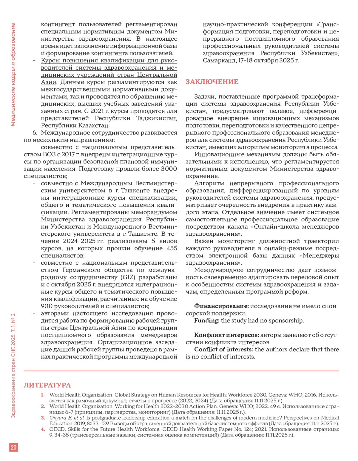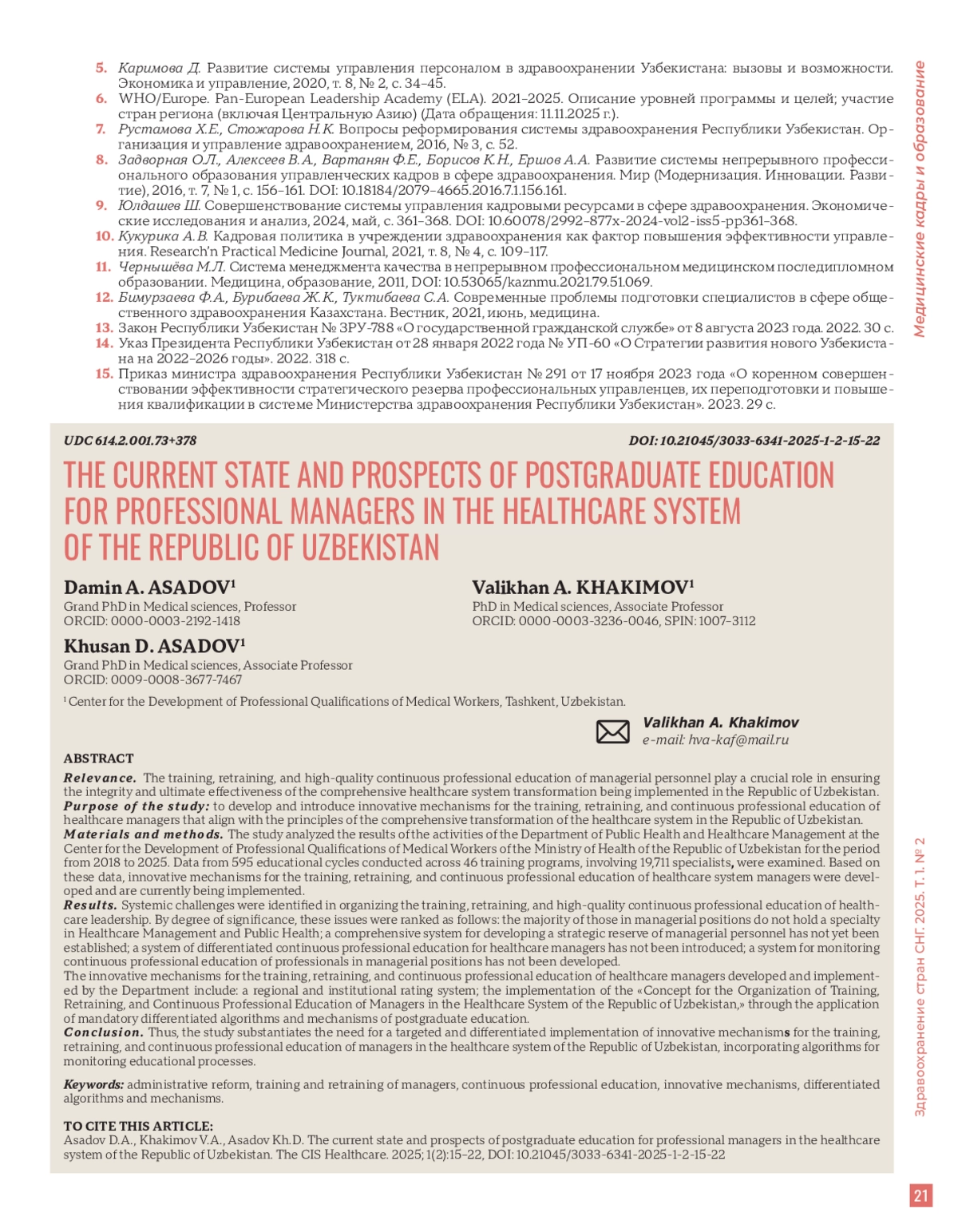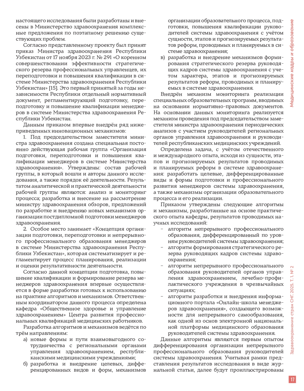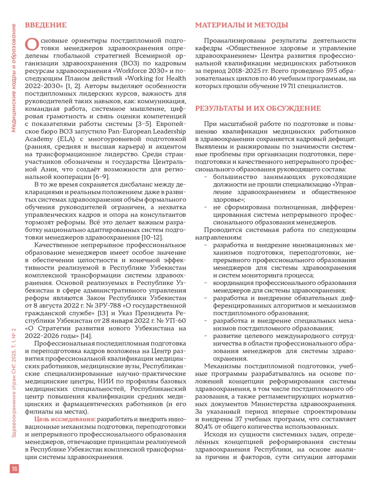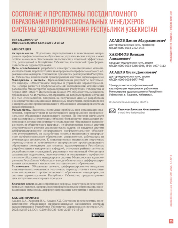 Актуальность. Подготовка, переподготовка и качественное непрерывное профессиональное образование управленческих кадров имеют особое значение в обеспечении целостности и конечной эффективности, реализуемой в Республике Узбекистан комплексной трансформации системы здравоохранения. Цель исследования: разработать и внедрить инновационные механизмы подготовки, переподготовки и непрерывного профессионального образования менеджеров, отвечающие принципам реализуемой в Республике Узбекистан комплексной трансформации системы здравоохранения. Материалы и методы. Проанализированы результаты деятельности кафедры «Общественное здоровье и управление здравоохранением» Центра развития профессиональной квалификации медицинских работников Министерства здравоохранения Республики Узбекистан за период 2018–2025 гг. Исследованы данные 595 образовательных циклов, проведенных по 46 учебным программам, на которых прошли обучение 19,7 тыс. специалистов. Опираясь на полученные данные разработаны и внедряются инновационные механизмы подготовки, переподготовки и непрерывного профессионального образования менеджеров системы здравоохранения. Результаты. Выявлены системные проблемы при организации подготовки, переподготовки и качественного непрерывного профессионального образования руководящего состава. По степени значимости они ранжированы следующим образом: большинство занимающих руководящие должности не имеют специальности «Управление здравоохранением и общественное здоровье», не сформирована полная система стратегического резерва управленческих кадров; не внедрена система дифференцированного непрерывного профессионального образования руководителей; не разработана система мониторинга непрерывного профессионального образования специалистов, работающих на руководящих должностях. К инновационным механизмам подготовки, переподготовки и качественного непрерывного профессионального образования менеджеров для системы здравоохранения Республики, разработанным и внедряемым кафедрой, относятся: рейтинг регионов, республиканских учреждений; реализация составленной «Концепции организации подготовки, переподготовки и непрерывного профессионального образования менеджеров в системе Министерства здравоохранения Республики Узбекистан» в виде обязательных дифференцированных алгоритмов и механизмов постдипломного образования. Заключение. Обосновано целевое, дифференцированное внедрение инновационных механизмов подготовки, переподготовки и качественного непрерывного профессионального образования менеджеров для системы здравоохранения Республики Узбекистан, предусматривающих алгоритмы мониторинга процесса.