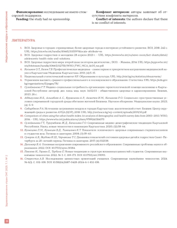 Заключение. В результате исследования показана необходимость внедрения механизмов оценки индекса здоровья жителей мегаполиса с учетом демографических и экологических особенностей. Для улучшения качества жизни и здоровья молодежи необходимы разработка и реализация инновационных программ формирования здоровьесберегающего поведения. Требуется комплексный подход к планированию городской среды и образовательного процесса для студенческой молодежи столицы Кыргызского государства.