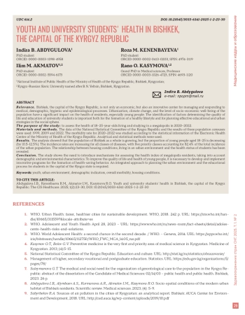 Результаты. Анализ показал, что численность населения г. Бишкека в целом растет, однако доля молодежи 18–25 лет снижается (на 10,5–12,5%). Показатели динамики заболеваемости растут по всем классам заболеваний, при этом пять приоритетных классов составляют 82,4% от общей заболеваемости городского населения. Выявлена зависимость между жилищными условиями, проживанием в городской среде и состоянием здоровья студентов.