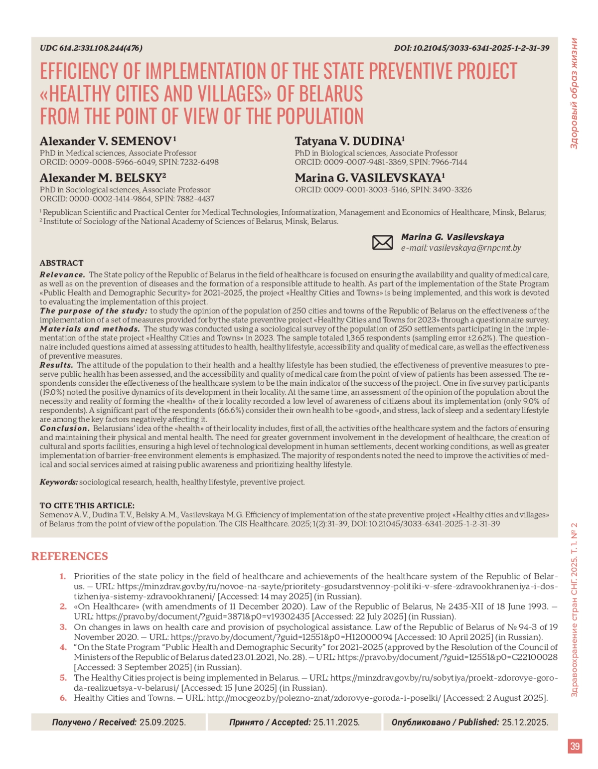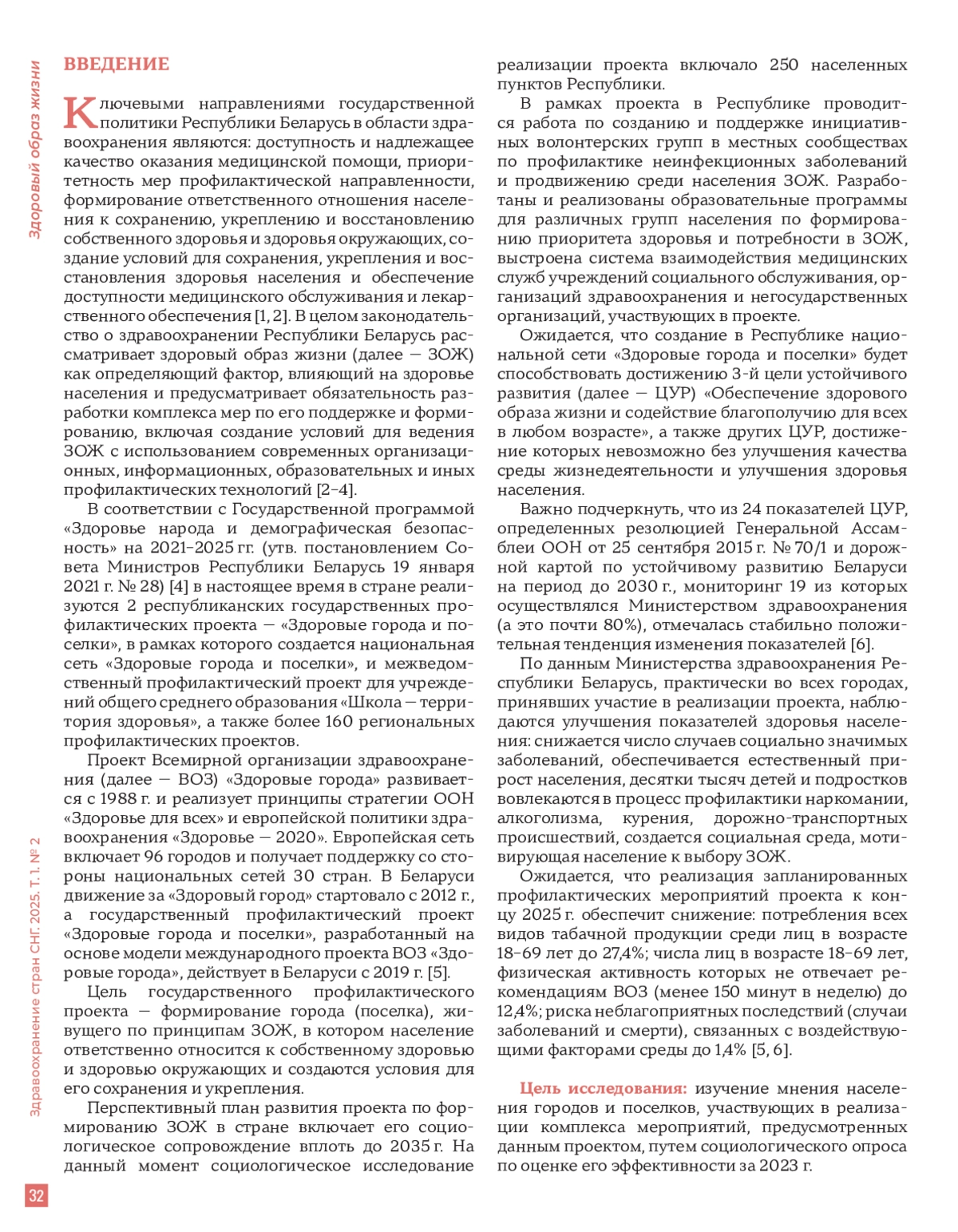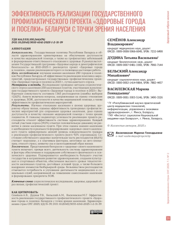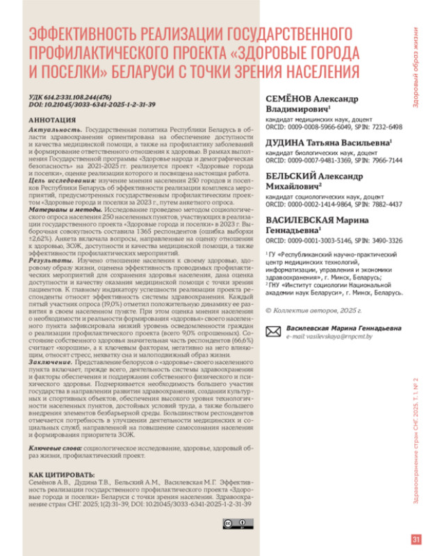 Актуальность. Государственная политика Республики Беларусь в области здравоохранения ориентирована на обеспечение доступности и качества медицинской помощи, а также на профилактику заболеваний и формирование ответственного отношения к здоровью. В рамках выполнения Государственной программы «Здоровье народа и демографическая безопасность» на 2021–2025 гг. реализуется проект «Здоровые города и поселки», оценке реализации которого и посвящена настоящая работа.