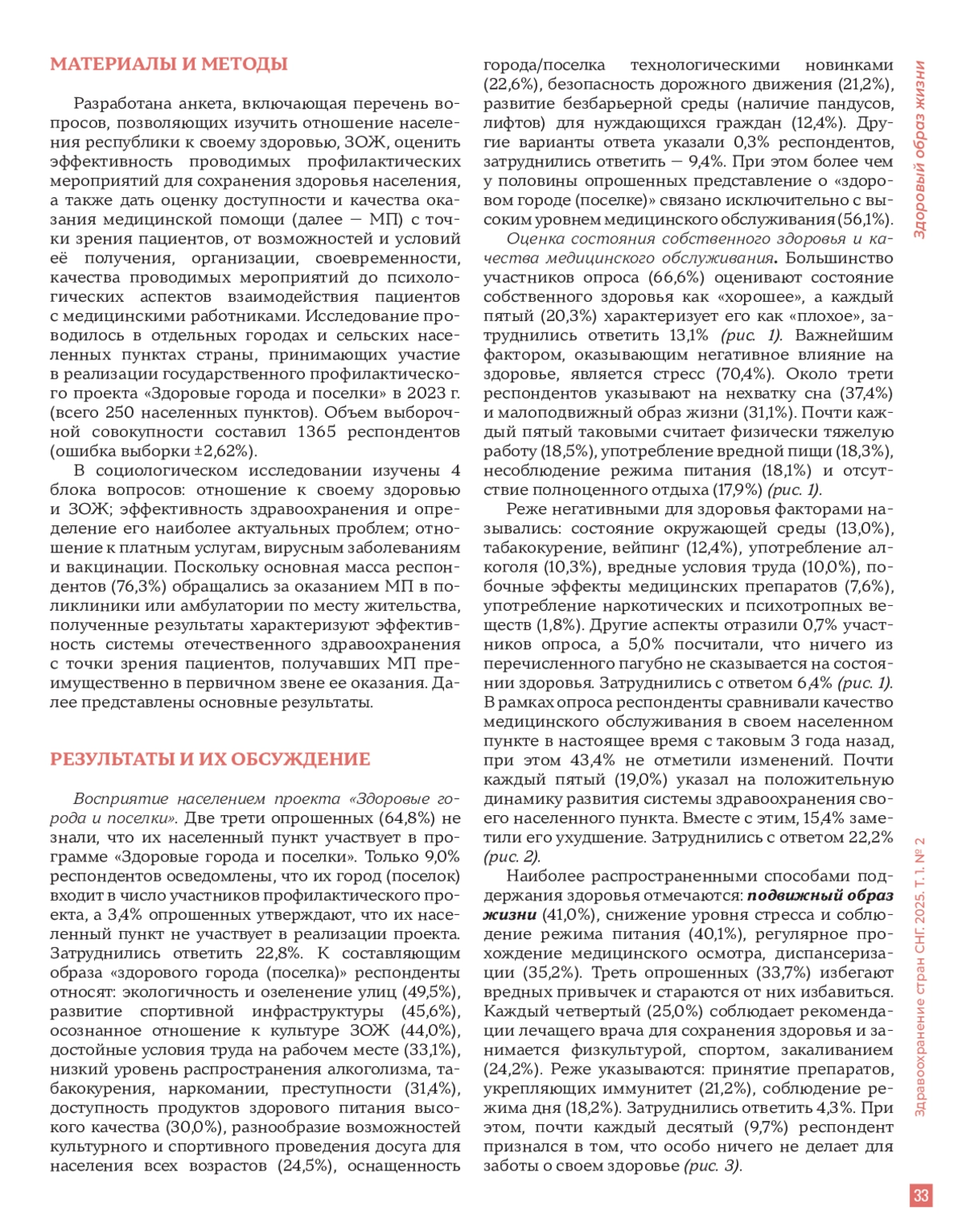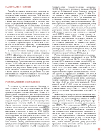 Материалы и методы. Исследование проведено методом социологического опроса населения 250 населенных пунктов, участвующих в реализации государственного проекта «Здоровые города и поселки» в 2023 г. Выборочная совокупность составила 1 365 респондентов (ошибка выборки ±2,62%). Анкета включала вопросы, направленные на оценку отношения к здоровью, ЗОЖ, доступности и качества медицинской помощи, а также эффективности профилактических мероприятий.