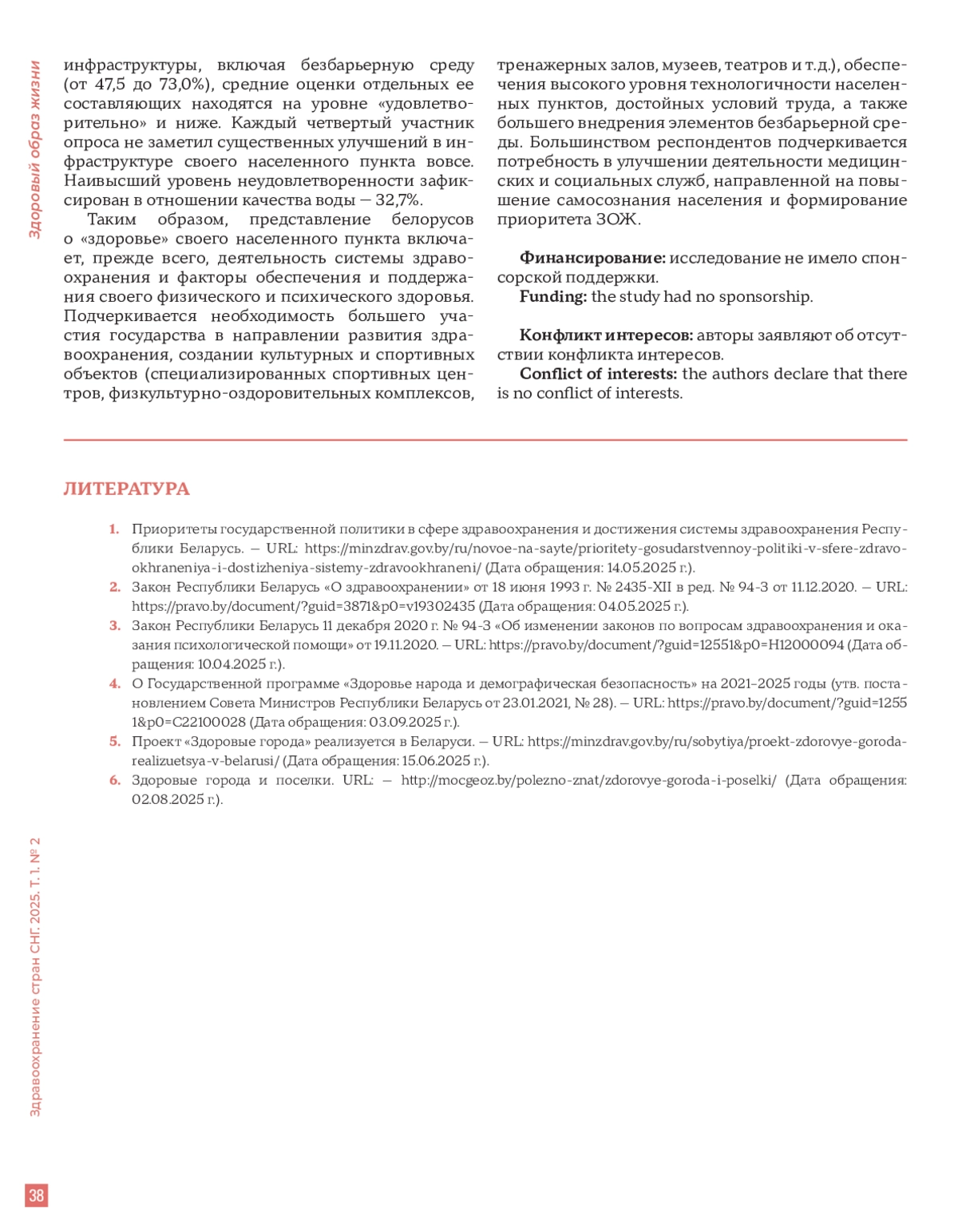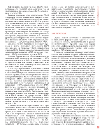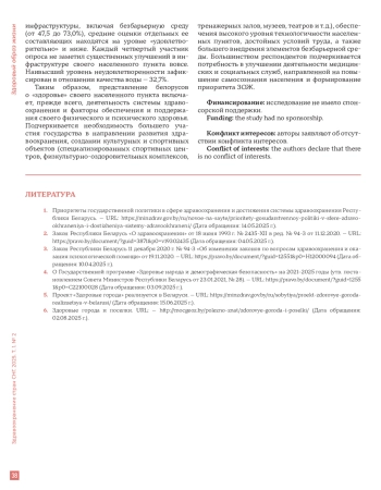 Заключение. Представление белорусов о «здоровье» своего населенного пункта включает, прежде всего, деятельность системы здравоохранения и факторы обеспечения и поддержания собственного физического и психического здоровья. Подчеркивается необходимость большего участия государства в направлении развития здравоохранения, создании культурных и спортивных объектов, обеспечения высокого уровня технологичности населенных пунктов, достойных условий труда, а также большего внедрения элементов безбарьерной среды. Большинством респондентов отмечается потребность в улучшении деятельности медицинских и социальных служб, направленной на повышение самосознания населения и формирования приоритета ЗОЖ.