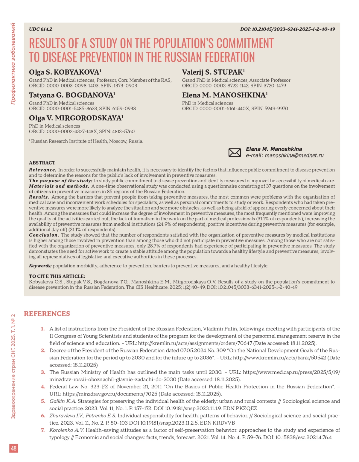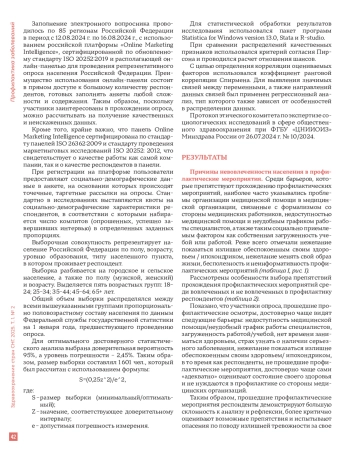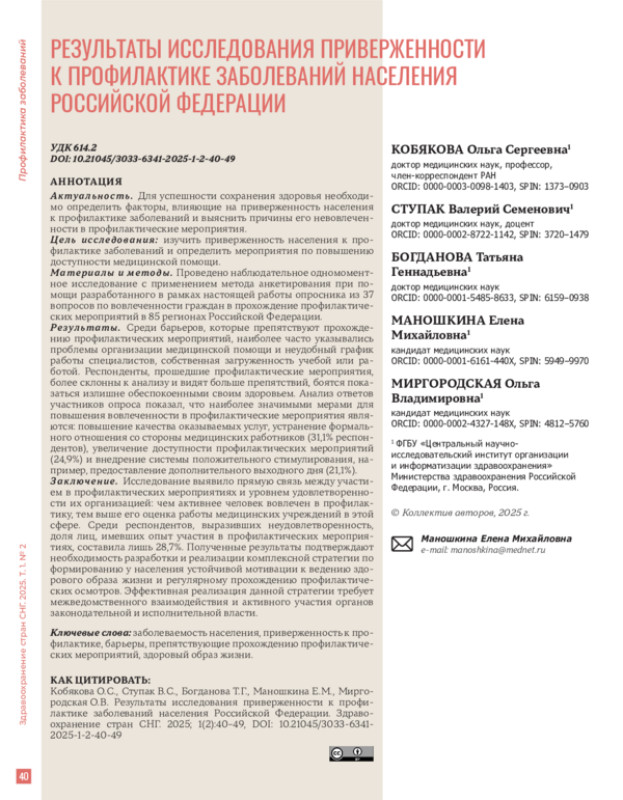 Материалы и методы. Проведено наблюдательное одномоментное исследование с применением метода анкетирования при помощи разработанного в рамках настоящей работы опросника из 37 вопросов по вовлеченности граждан в прохождение профилактических мероприятий в 85 регионах Российской Федерации.