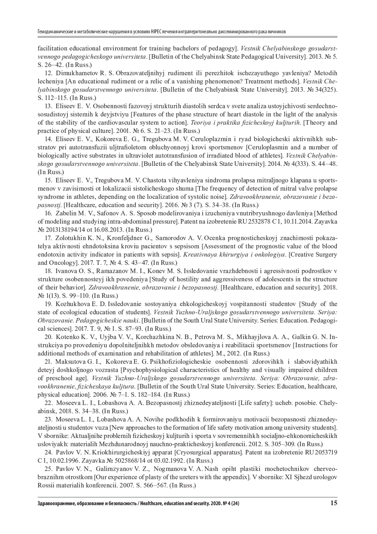 15. Елисеев, Е. В. Частота выявления синдрома пролапса митрального клапана у спортсменов в зависимости от локализации систолического шума / Е. В. Елисеев, М. В. Трегубова // Здравоохранение, образование и безопасность. - 2016. - № 3 (7). - С. 34-38.