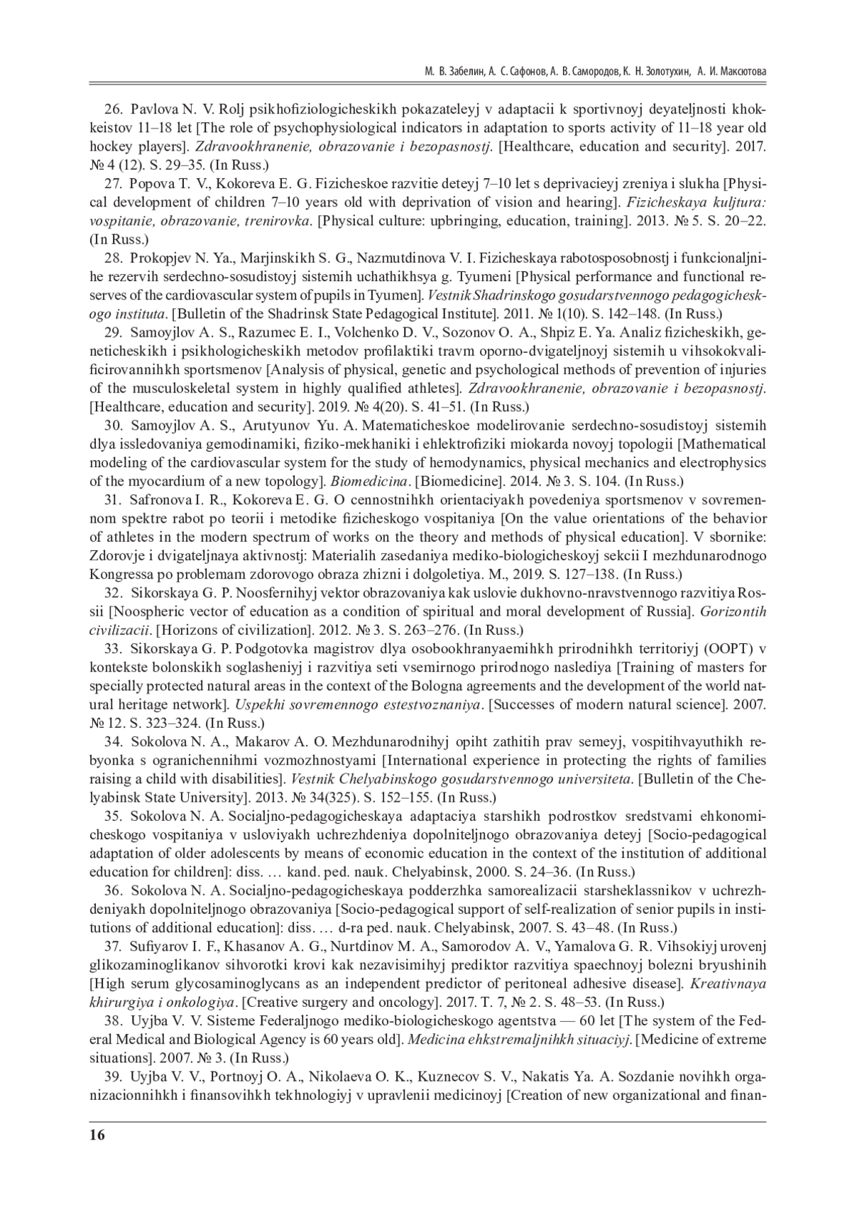 29. Самойлов, А. С. Анализ физических, генетических и психологических методов профилактики травм опорно-двигательной системы у высококвалифицированных спортсменов / А. С. Самойлов, Е. И. Разумец, Д. В. Волченко, О. А. Созонов, Е. Я. Шпиз // Здравоохранение, образование и безопасность. - 2019. - № 4(20). - С. 41-51.