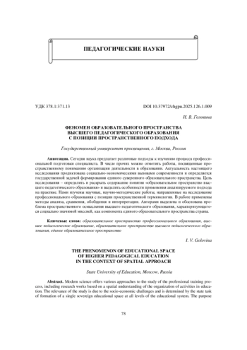 Сегодня наука предлагает различные подходы к изучению процесса профессиональной подготовки специалиста. В числе прочих можно отметить работы, посвященные пространственному пониманию организации деятельности в образовании. Актуальность настоящего исследования продиктована социально-экономическими вызовами современности и определяется государственной задачей формирования единого суверенного образовательного пространства. Цель исследования - определить и раскрыть содержание понятия «образовательное пространство высшего педагогического образования» и выделить особенности применения анализируемого подхода на практике. Нами изучены научные, научно-методические работы, направленные на исследованиепрофессионального образования с позиции пространственной терминологии. В работе применены методы анализа, сравнения, обобщения и интерпретации. Авторами выделена и обоснована проблема пространственного осмысления высшего педагогического образования, характеризующегося социально значимой миссией, как компонента единого образовательного пространства страны.