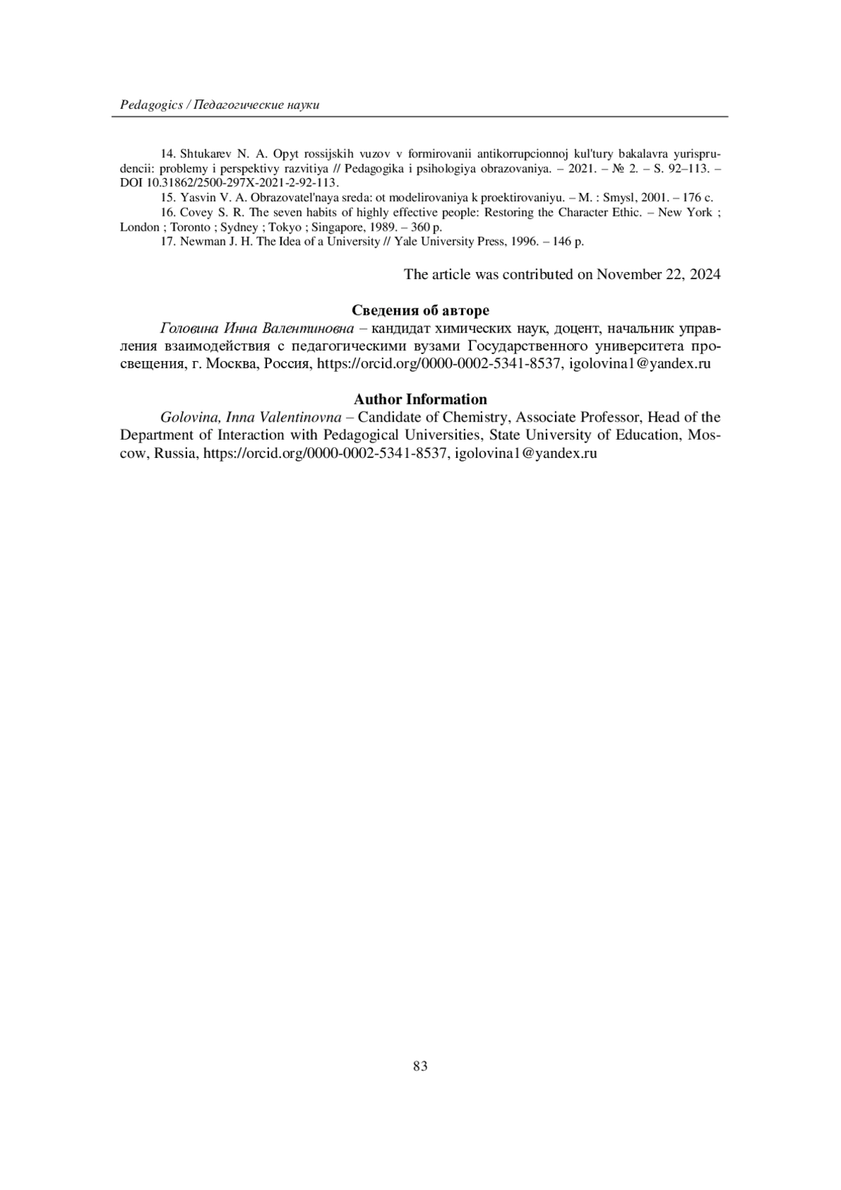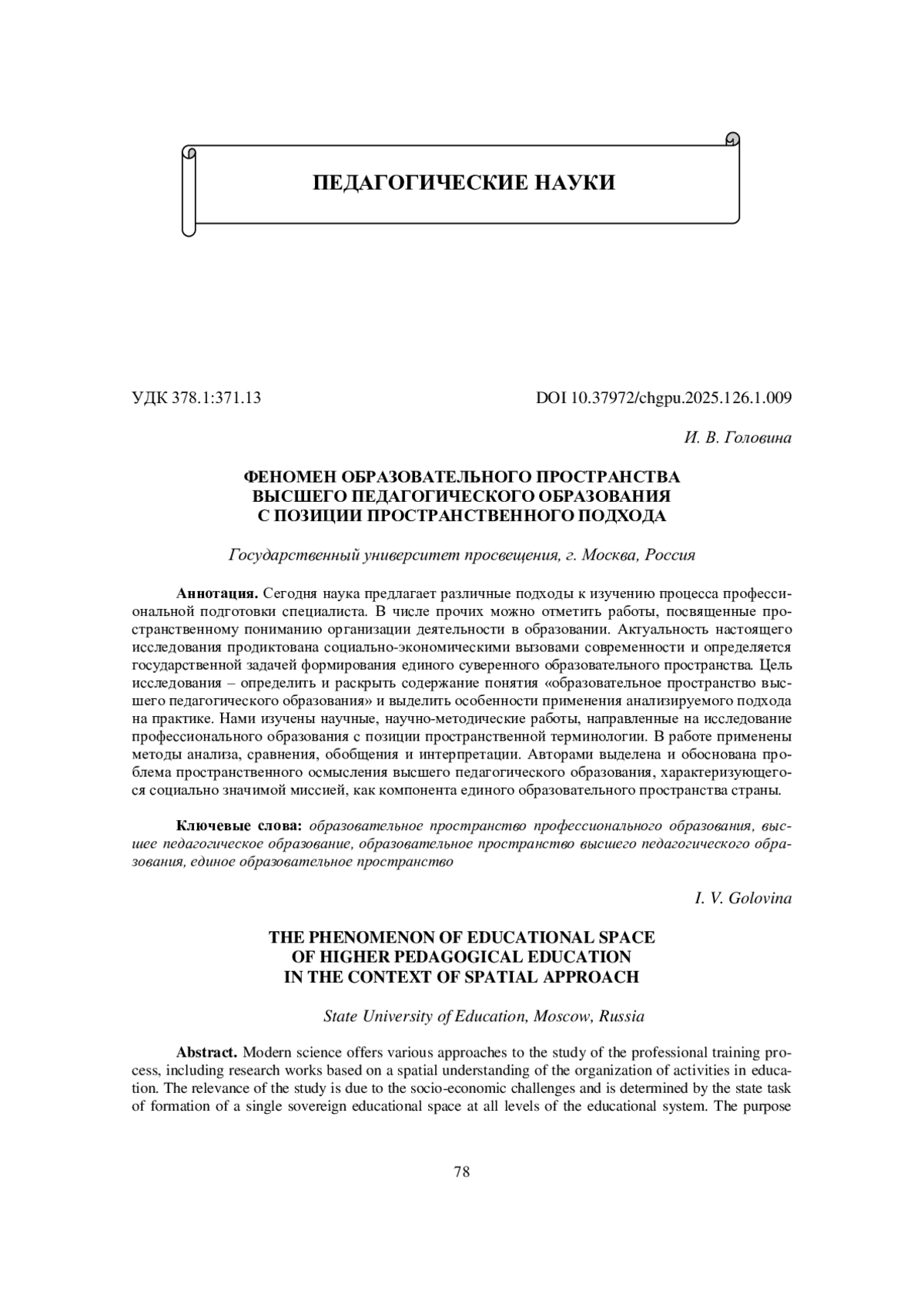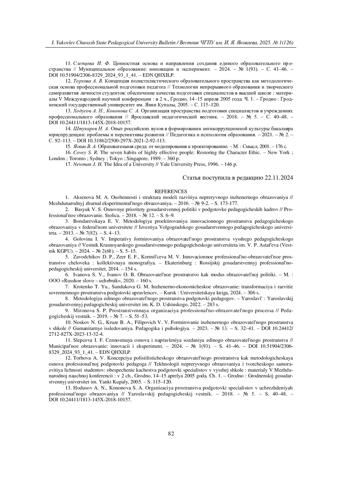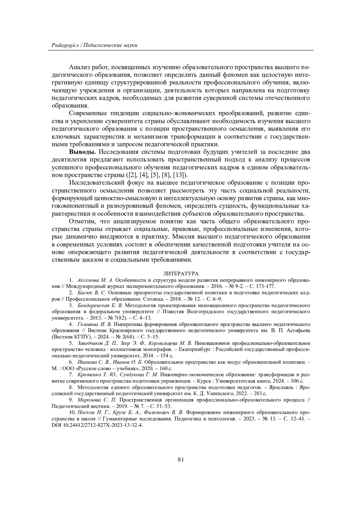 4. Головина И. В. Императивы формирования образовательного пространства высшего педагогического образования // Вестник Красноярского государственного педагогического университета им. В. П. Астафьева (Вестник КГПУ). - 2024. - № 2(68). - С. 5-15. EDN: CJMOFR