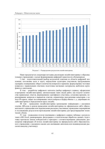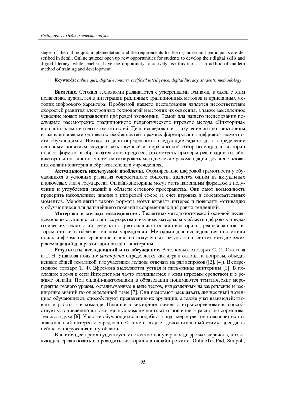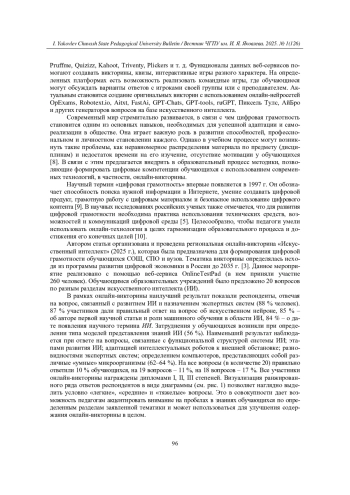 В статье рассматривается необходимость интеграции в современной педагогике традиционного педагогического метода «Викторина» и прикладных методик в связи с ускоренными темпами развития новых технологий. Целью исследования является изучение данного средства и его методических особенностей для формирования цифровой грамотности у обучающихся. Подчеркиваются возможности онлайн-викторин в получении и углублении знаний, повышении интереса и мотивации для дальнейшего познания современных информационных тенденций. Теоретико-методологической основой исследования послужили стратегии государства, научные материалы в области электронных и педагогических технологий, а также результаты региональной онлайн-викторины, реализованной в образовательном учреждении. Даны определения таким основным понятиям, как викторина, онлайн-викторина и цифровая грамотность. Перечислены популярные сервисы, позволяющие организовать и проводить викторины в онлайн-режиме. Приводятся результаты анализа онлайн-викторины «Искусственный интеллект», организованной и проведенной автором статьи среди обучающихся СОШ, СПО и вузов с целью формирования цифровой грамотности. Отмечается, что визуализация ранжированного ряда ответов участников в виде диаграммы помогает определить «легкие», «средние» и «тяжелые» вопросы онлайн-викторины для дальнейшего ее усовершенствования. Подробно описываются основные этапы реализации рассматриваемого средства и требования к организатору и участникам онлайн-викторины. Результаты исследования позволили сделать вывод о том, что подобного рода способы проверки знаний открывают обучающимся новые возможности для развития их навыков и цифровой грамотности, а педагогам дают возможность активно использовать данное средство как дополнительный современный метод обучения и развития.