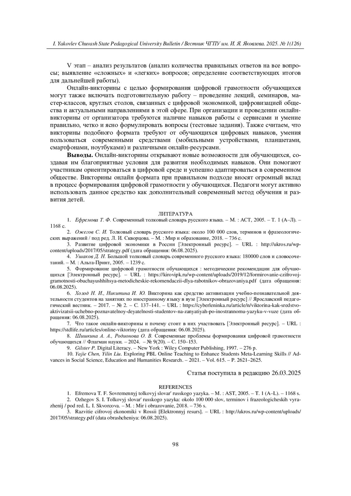 6. Холод Н. И., Никитина И. Ю. Викторина как средство активизации учебно-познавательной деятельности студентов на занятиях по иностранному языку в вузе [Электронный ресурс] // Ярославский педагогический вестник. - 2017. - № 2. - С. 137-141. - URL: https://cyberleninka.ru/article/n/viktorina-kak-sredstvo-aktivizatsii-uchebno-poznavatelnoy-deyatelnosti-studentov-na-zanyatiyah-po-inostrannomu-yazyku-v-vuze(дата обращения: 06.08.2025). EDN: YQYMUD