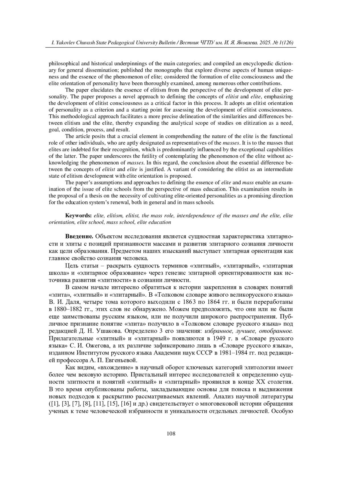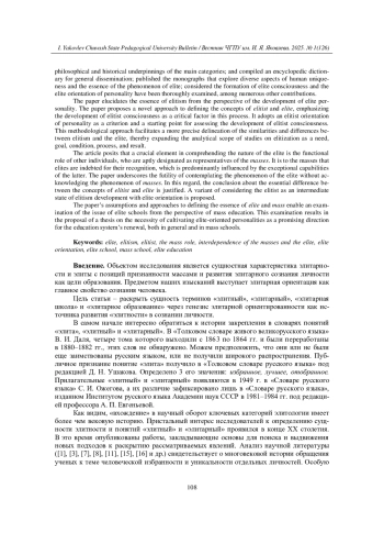 В статье утверждается, что важным фактором в понимании сущности элиты является функциональная роль других личностей, которых уместно назвать представителями масс («массами»). Именно им элиты обязаны своим признанием, во многом определяемым выдающимися способностями последних. В работе делается акцент на непродуктивности изучения исследуемого феномена без связи с явлением «массовости». В связи с этим обоснован вывод о сущностном различии понятий «элитарный» и «элитный». Предложен вариант рассмотрения элитарного как промежуточного состояния развития элитности с ориентацией на элиту.