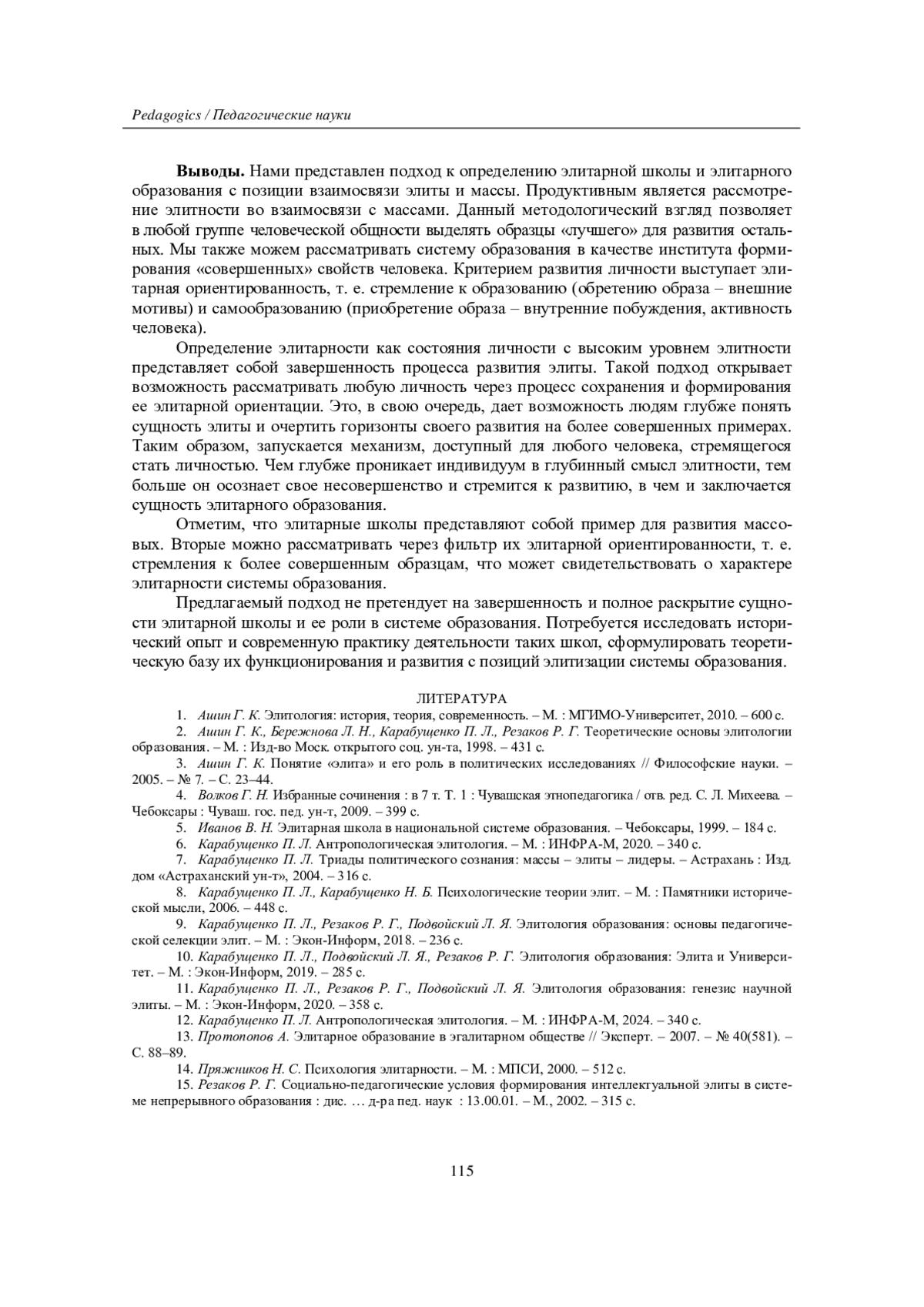 10. Карабущенко П. Л., Подвойский Л. Я., Резаков Р. Г. Элитология образования: Элита и Университет. - М.: Экон-Информ, 2019. - 285 с. EDN: GZLTYP