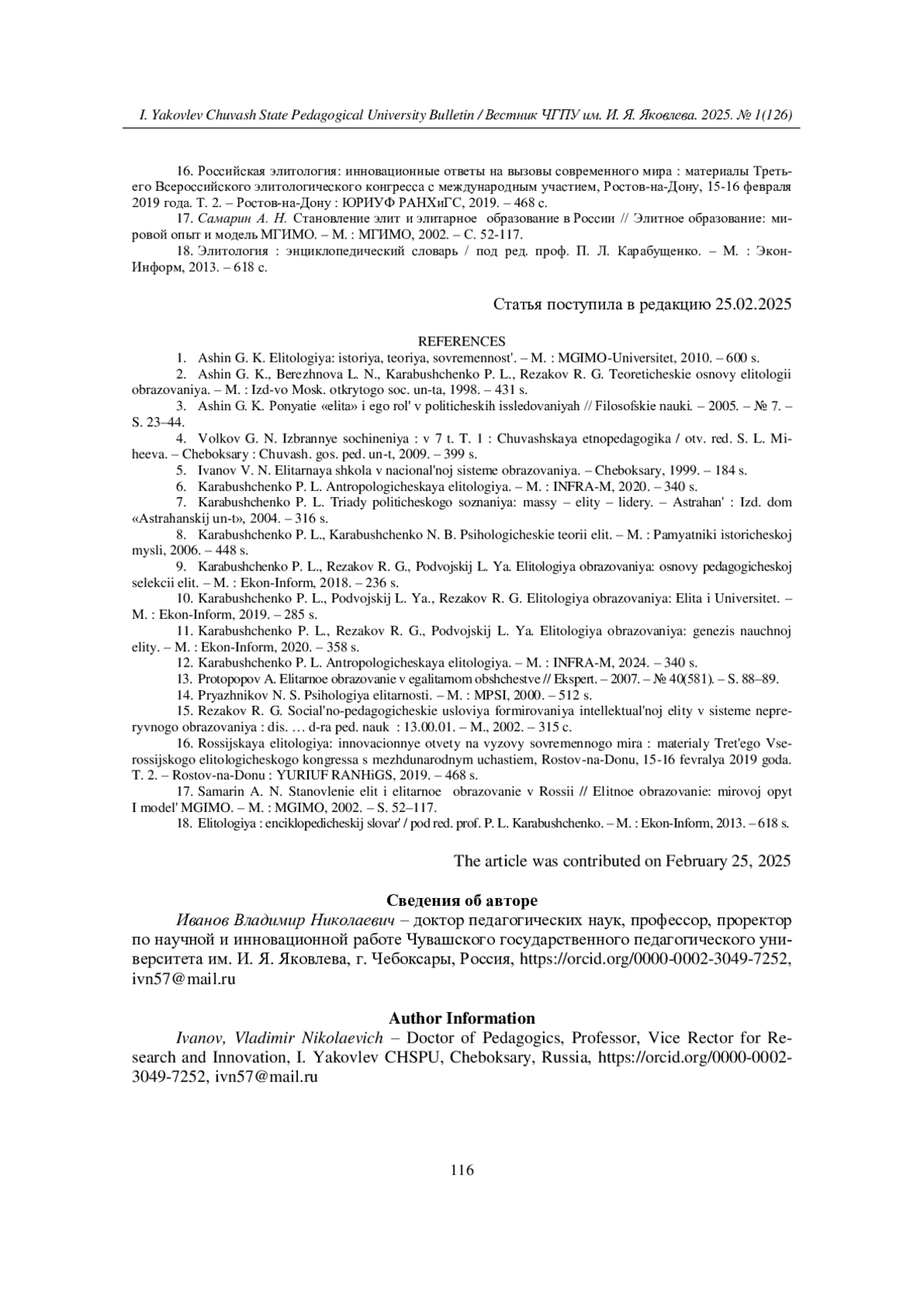 11. Карабущенко П. Л., Резаков Р. Г., Подвойский Л. Я. Элитология образования: генезис научной элиты. - М.: Экон-Информ, 2020. - 358 с.