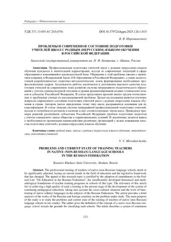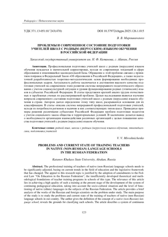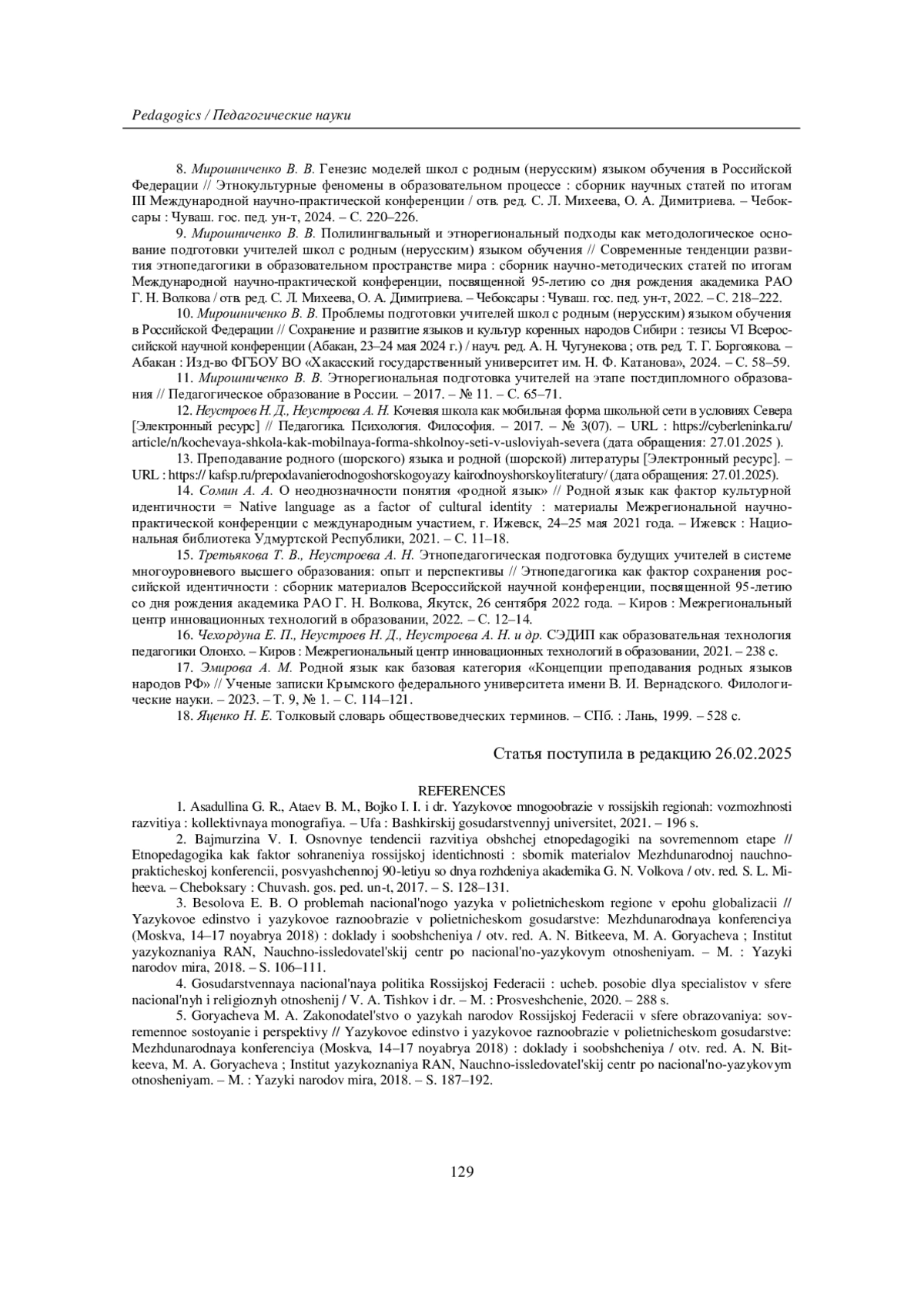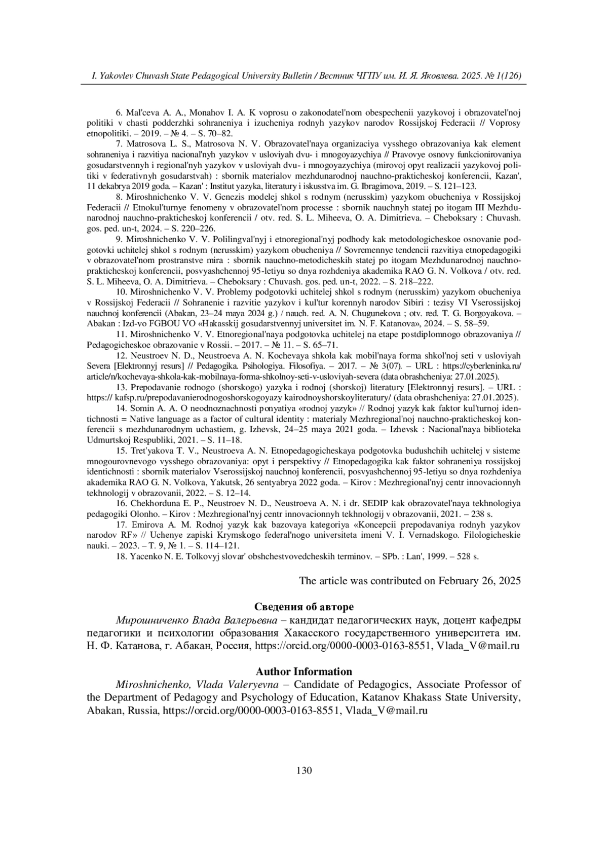 10. Мирошниченко В. В. Проблемы подготовки учителей школ с родным (нерусским) языком обучения в Российской Федерации // Сохранение и развитие языков и культур коренных народов Сибири: тезисы VI Всероссийской научной конференции (Абакан, 23-24 мая 2024 г.) / науч. ред. А. Н. Чугунекова; отв. ред. Т. Г. Боргоякова. - Абакан: Изд-во ФГБОУ ВО “Хакасский государственный университет им. Н. Ф. Катанова”, 2024. - С. 58-59. EDN: BJRHYR