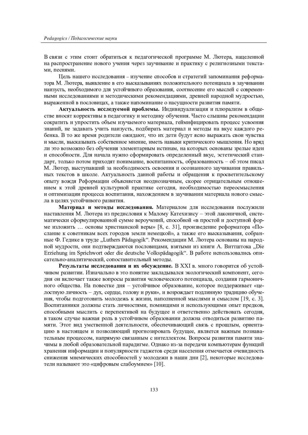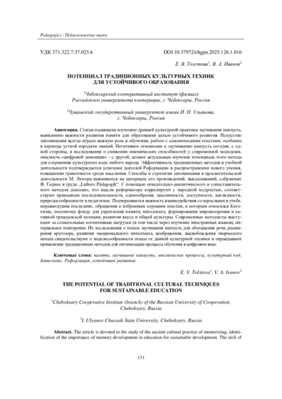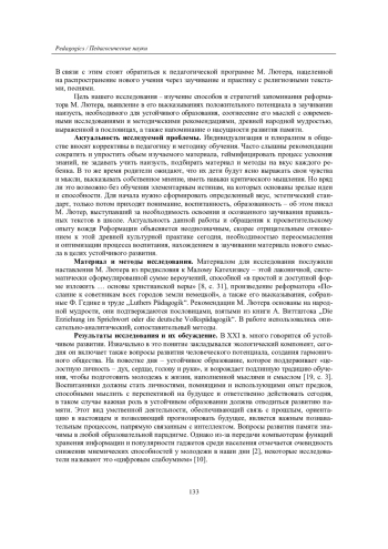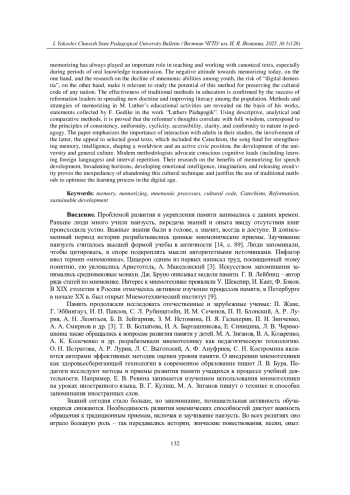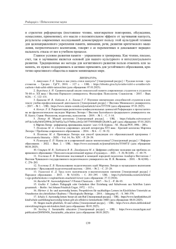 Статья посвящена изучению древней культурной практики заучивания наизусть, выявлению важности развития памяти для образования целью устойчивого развития. Искусство запоминания всегда играло важную роль в обучении, работе с каноническими текстами, особенно в периоды устной передачи знаний. Негативное отношение к заучиванию наизусть сегодня, с одной стороны, и исследования о снижении мнемических способностей у современной молодежи, опасность «цифровой деменции» - с другой, делают актуальным изучение потенциала этого метода для сохранения культурного кода любого народа. Эффективность традиционных методов в учебной деятельности подтверждается успехами деятелей Реформации в распространении нового учения, повышении грамотности среди населения. Способы и стратегии запоминания в просветительской деятельности М. Лютера выявляются на материале его произведений, высказываний, собранных Ф. Гедике в труде „Luthers Pädagogik“. С помощью описательно-аналитического и сопоставительного методов доказано, что мысли реформатора коррелируют с народной мудростью, соответствуют принципам последовательности, единообразия, цикличности, доступности, наглядности, природосообразности в педагогике. Подчеркивается важность взаимодействия со взрослыми в учебе, неравнодушия последних, обращения к избранным хорошим текстам, к которым относился Катехизис, песенному фонду для укрепления памяти, интеллекта, формирования мировоззрения и активной гражданской позиции, развития вкуса и общей культуры. Современные методисты выступают за сознательные когнитивные нагрузки (в том числе через изучение иностранных языков), интервальное повторение. Их исследования о пользе заучивания наизусть для обогащения речи, расширения кругозора, развития эмоционального интеллекта, воображения, высвобождения творческого начала свидетельствуют о нецелесообразности отказа от данной культурной техники и оправдывают применение традиционных методов для оптимизации процесса обучения в цифровом веке.