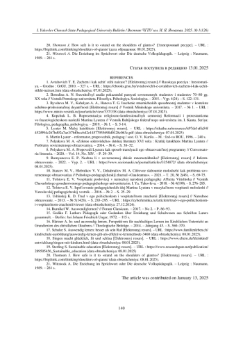 12. Толстова Е. В. Использование педагогических идей Мартина Лютера в музыкальном воспитании молодежи // Ярославский педагогический вестник. - 2016. - № 2. - С. 25-29. EDN: WCLPYZ