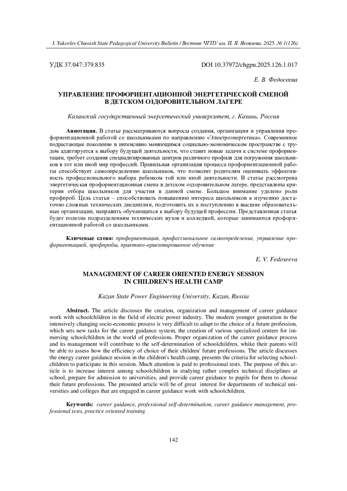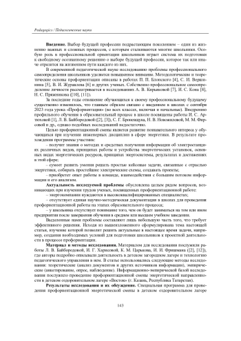В статье рассматриваются вопросы создания, организации и управления профориентационной работой со школьниками по направлению «Электроэнергетика». Современное подрастающее поколение в интенсивно меняющимся социально-экономическом пространстве с трудом адаптируется к выбору будущей деятельности, что ставит новые задачи к системе профориентации, требует создания специализированных центров различного профиля для погружения школьников в тот или иной мир профессий. Правильная организация процесса профориентационной работы способствует самоопределению школьников, что позволит родителям оценивать эффективность профессионального выбора ребенком той или иной деятельности. В статье рассмотрена энергетическая профориентационная смена в детском оздоровительном лагере, представлены критерии отбора школьников для участия в данной смене. Большое внимание уделено роли профпроб. Цель статьи - способствовать повышению интереса школьников к изучению достаточно сложных технических дисциплин, подготовить их к поступлению в высшие образовательные организации, направить обучающихся к выбору будущей профессии. Представленная статья будет полезна подразделениям технических вузов и колледжей, которые занимаются профориентационной работой со школьниками.
