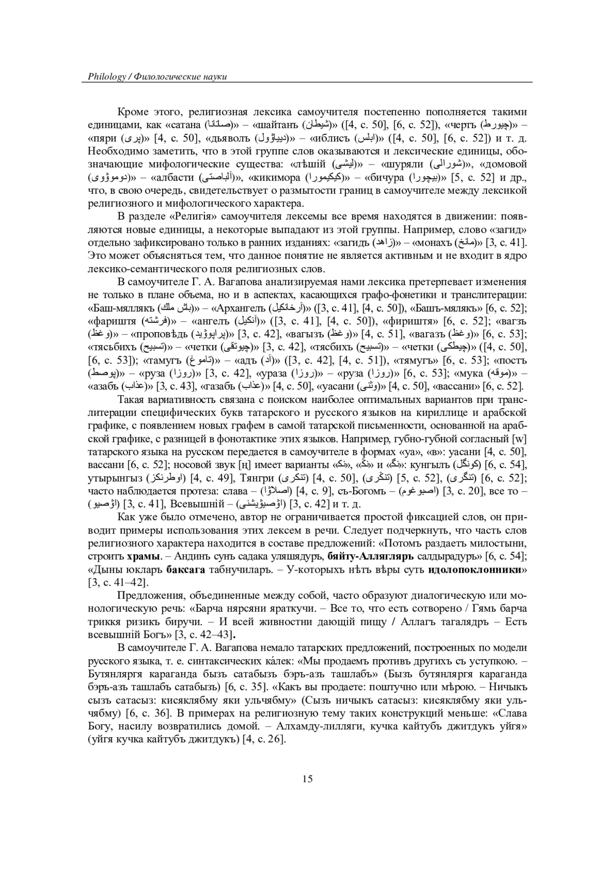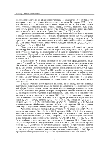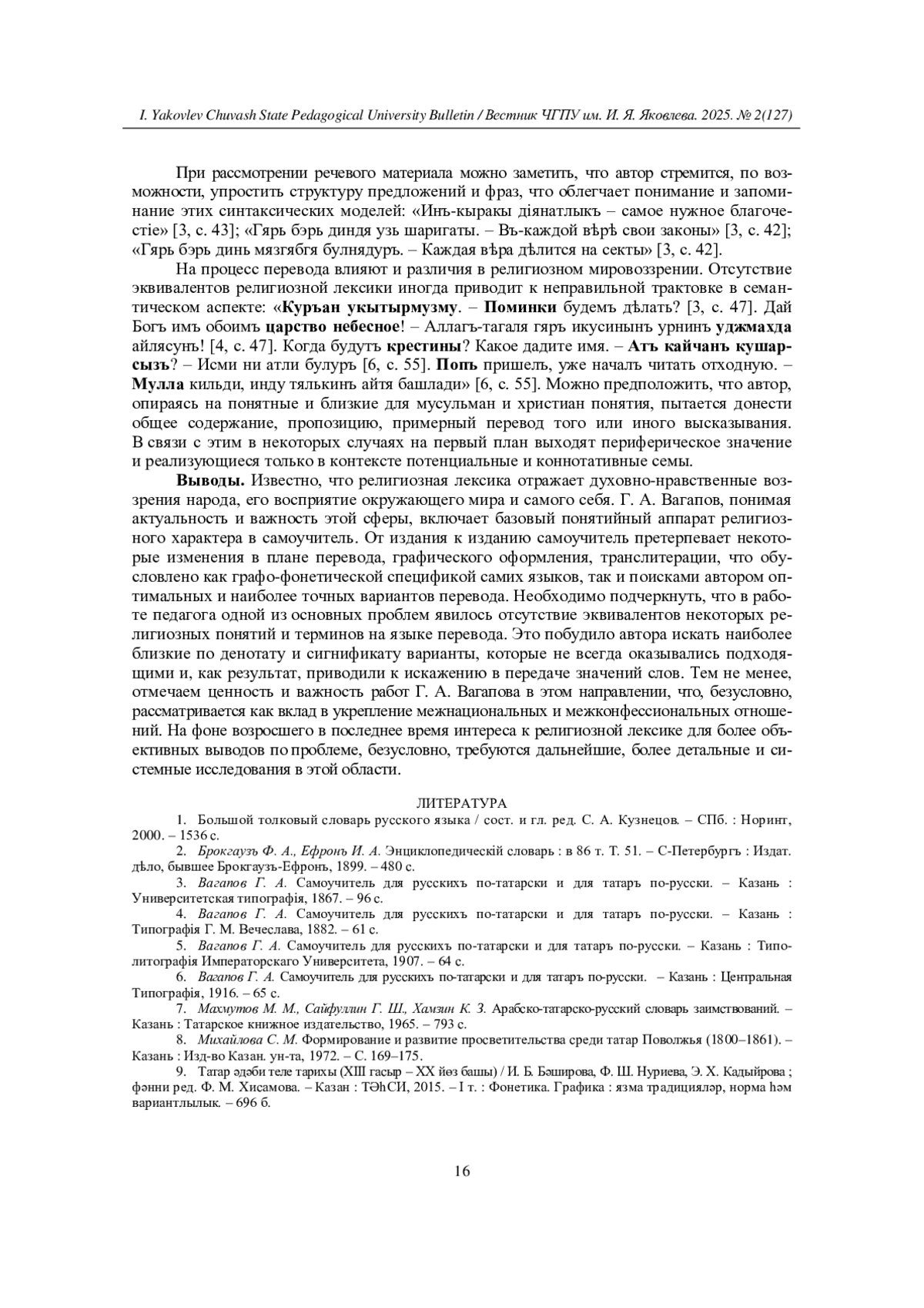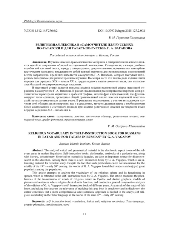 В настоящей статье делается попытка анализа лексики религиозной сферы, нашедшей отражение в самоучителе Г. А. Вагапова. В рамках исследования рассматриваются передача слов религиозного характера на кириллице и арабской графике, модели фраз и предложений, где функционируют такие единицы, проводится общий сравнительный анализ лексики изучаемой тематической группы в самоучителе разных годов. В результате исследования, с учетом актуальности изучения этой области как в синхронии, так и в диахронии, автором делается вывод о необходимости более комплексного и системного подхода при анализе религиозной лексики на татарском языке в трудах середины XIX - начала XX в.