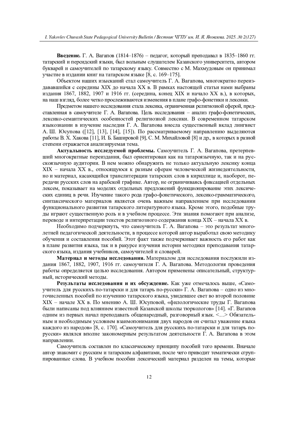 Изучение лексико-грамматического материала в диахроническом аспекте является одной из актуальных областей в современной лингвистике. Самоучители, словари, учебные пособия той или иной эпохи, наряду с литературным, документальным, историческим или публицистическим наследием, представляют собой важный источник для разноплановых исследований в этом направлении. Среди них выделяется самоучитель Г. А. Вагапова, который выступает интересным материалом для разностороннего изучения. Несмотря на то что такого рода издания были нередки для середины XIX - начала XX в., труды педагога нашли своего читателя, они пользовались большой популярностью среди населения.